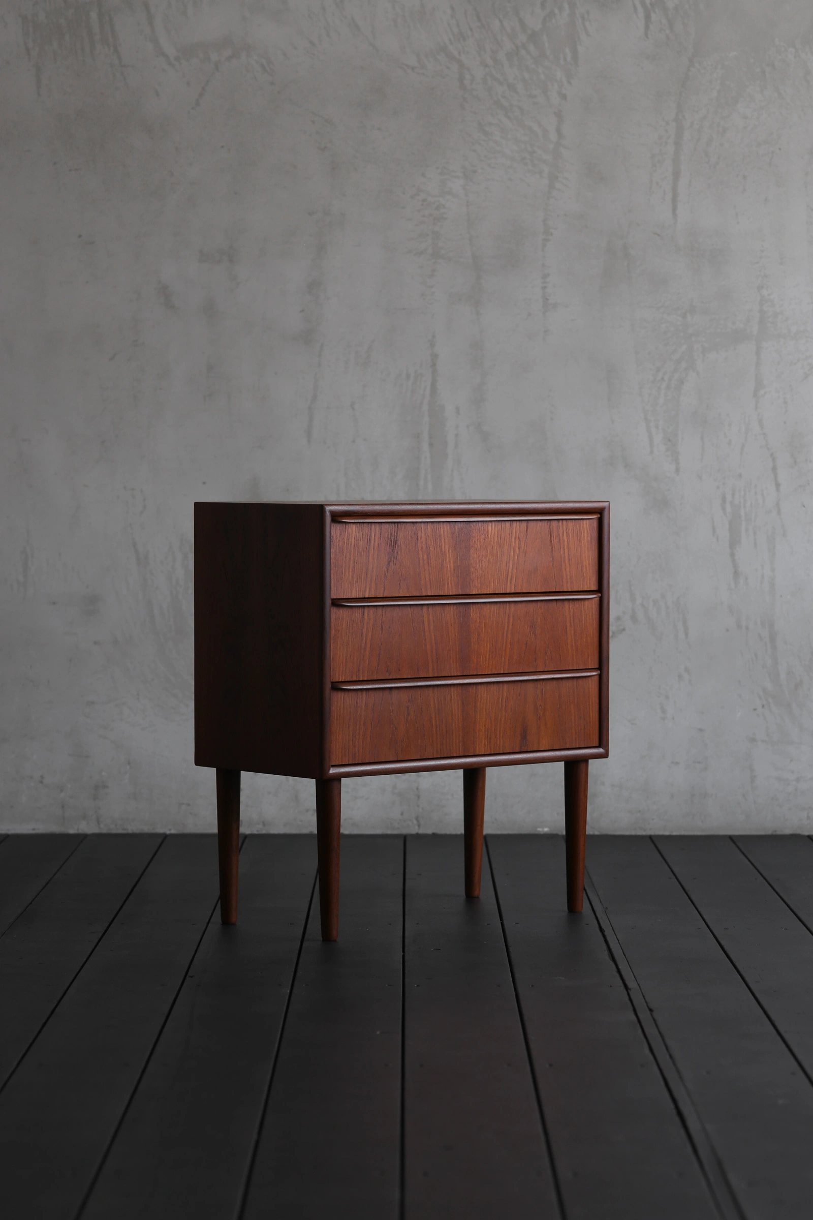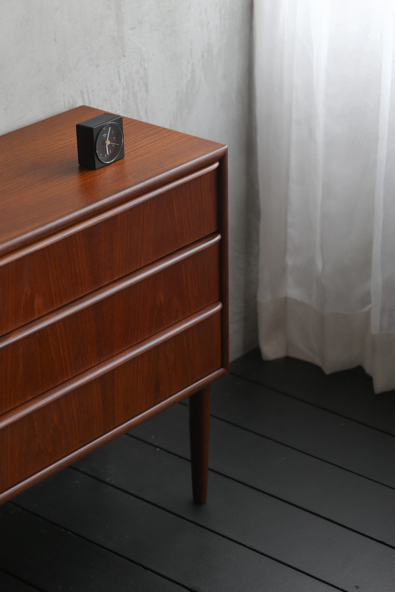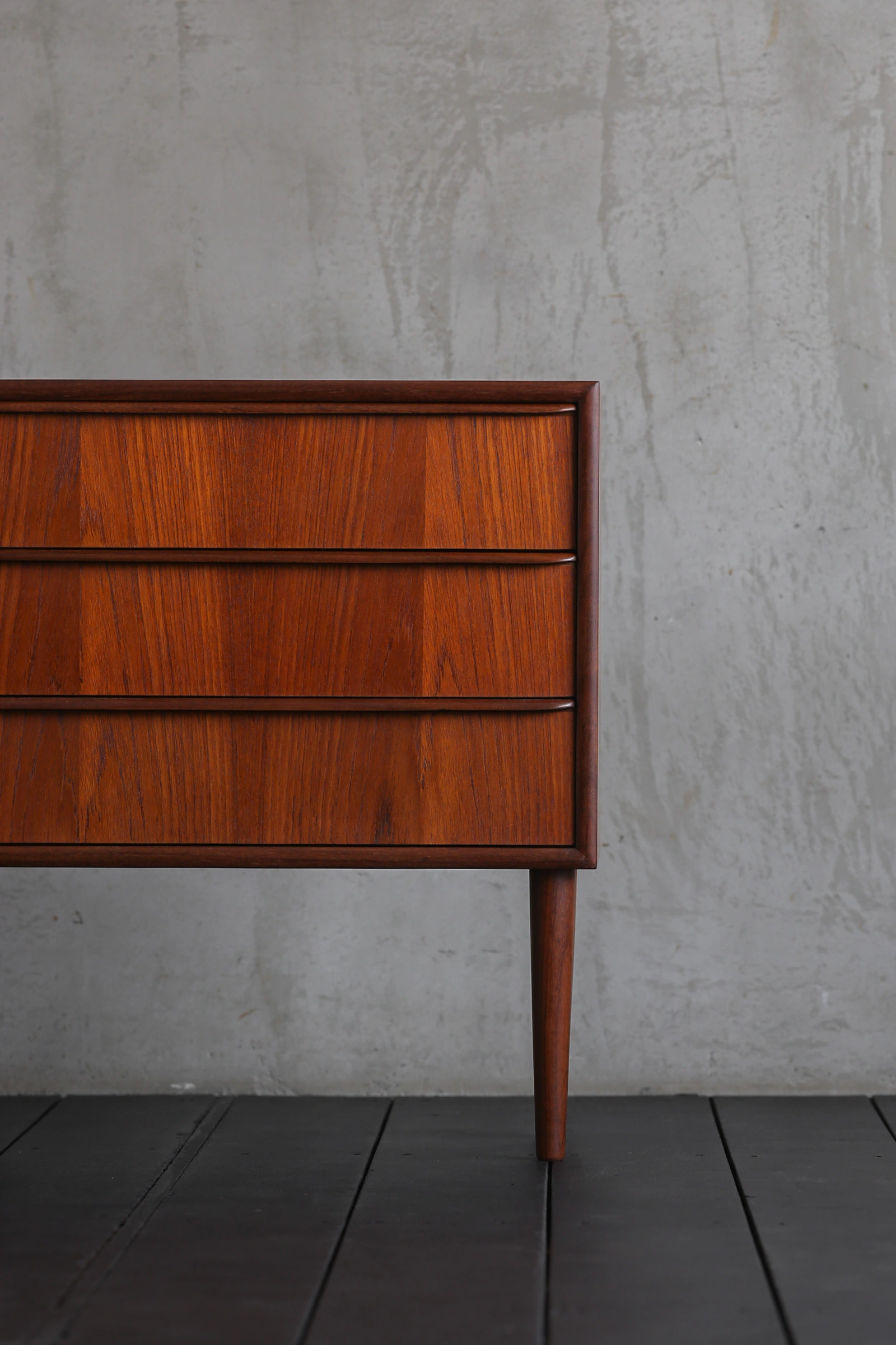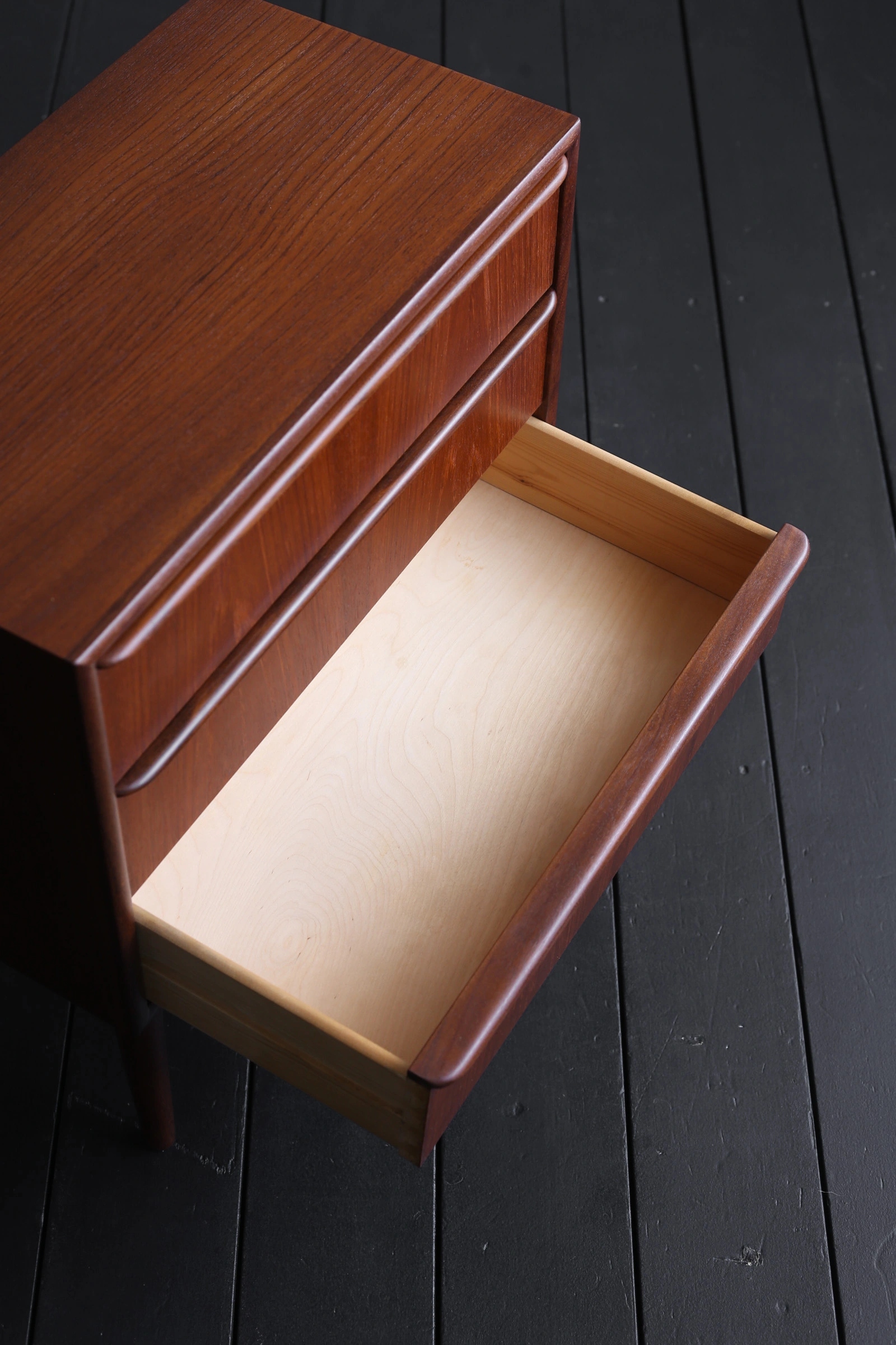 本体枠は小口が見えないよう接合部分が斜めに剥ぎ合わせられ、木目が天板から側面へと水が流れるようだ。だからこそ、経年で深く色付いたチークの上品な木目がより美しく感じられるのだろう。シンプルなハンドルは滑らかな曲面に仕上げられており、手がかりも良く、軽い力で引出もスムーズに動く。枠も正面から見るとハンドルの意匠に合わせて曲面に加工されており、簡潔さの中にも細部にまでこだわり抜いた作者の意図が読み取れる。脚元はスラリと伸びたテーパードレッグでまとめ、軽やかな印象。飽きの来ない実直なデザインであるから、末永くご愛用いただけるだろう。