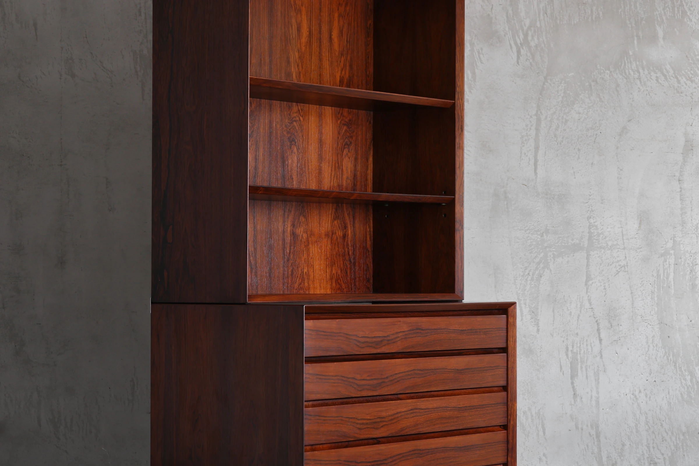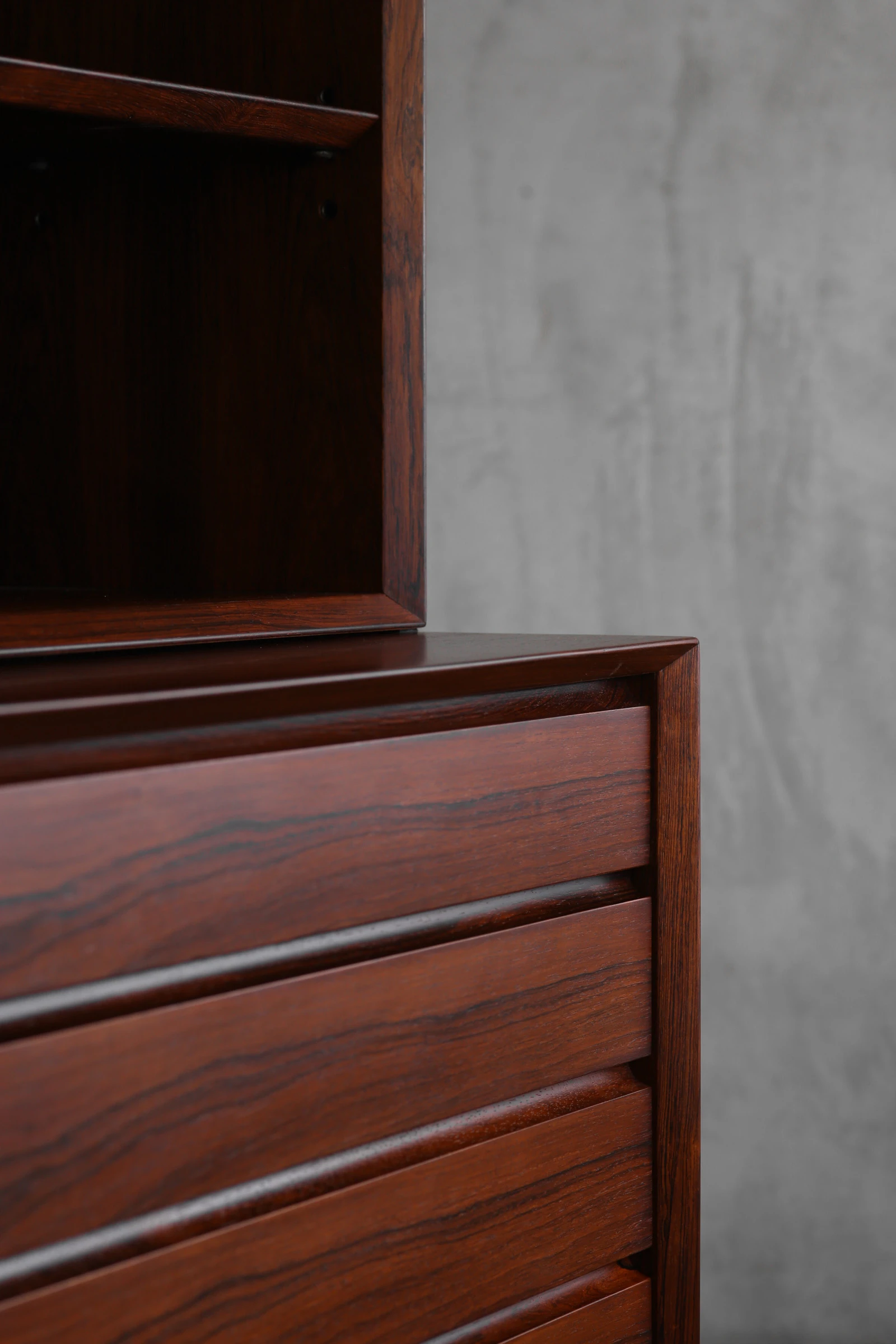 上台はオープンスペース。上段は固定棚、下段は可動棚である。可動棚を活かして、柔軟な収納が可能だが、背板のローズウッドの木目が見事なため、ぜひ余白を持ってディスプレイを楽しんでいただきたい。下段は4杯の引出がセットされ、雑多な日用品を仕舞うのに丁度いい。引出にハンドルを設けずとも手掛かりはよく、動作はスムーズ。要素を少なくすることで生まれた余白は素材が持つ魅力を最大限伝えてくれる。