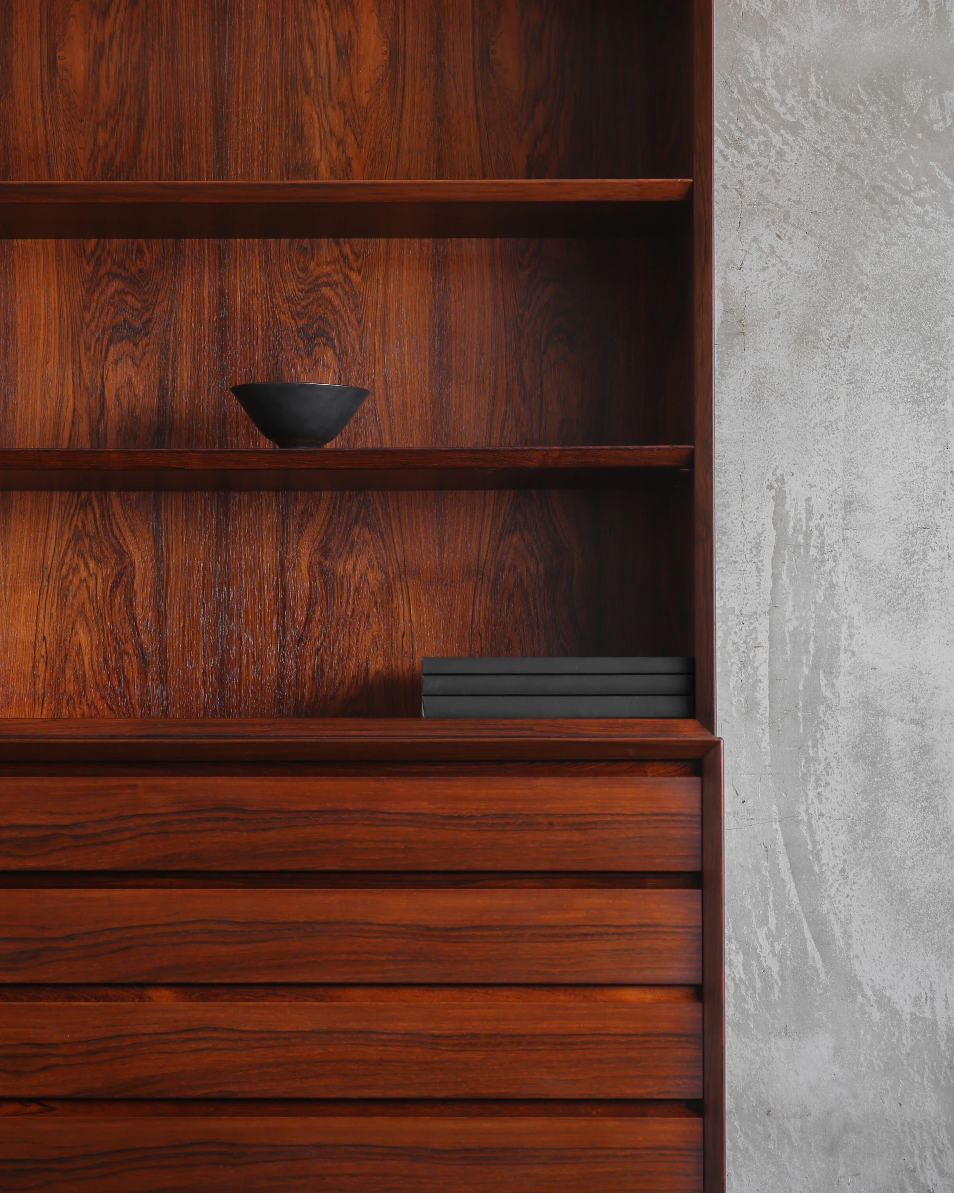 素材はローズウッド。艶やかで色気があり、楽器やビリヤードのキューなど趣向品に用いられており、当時から人々を魅了し続けている木材だ。現在では、輸出入が制限された希少種であり、製作された家具は、資源豊かな60年代を象徴する産物でもある。