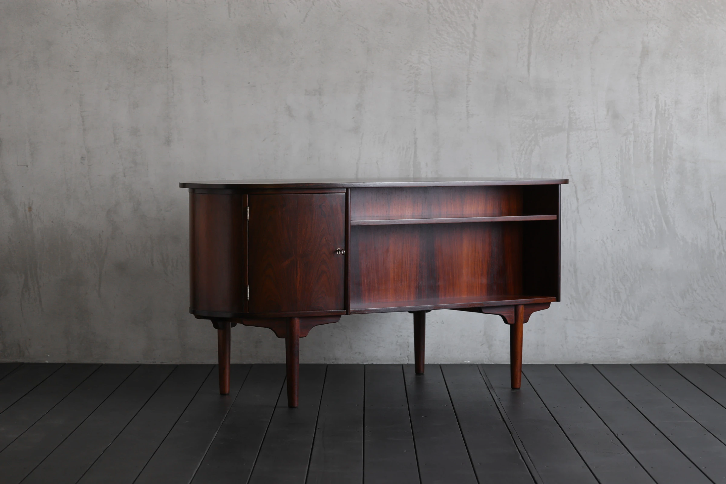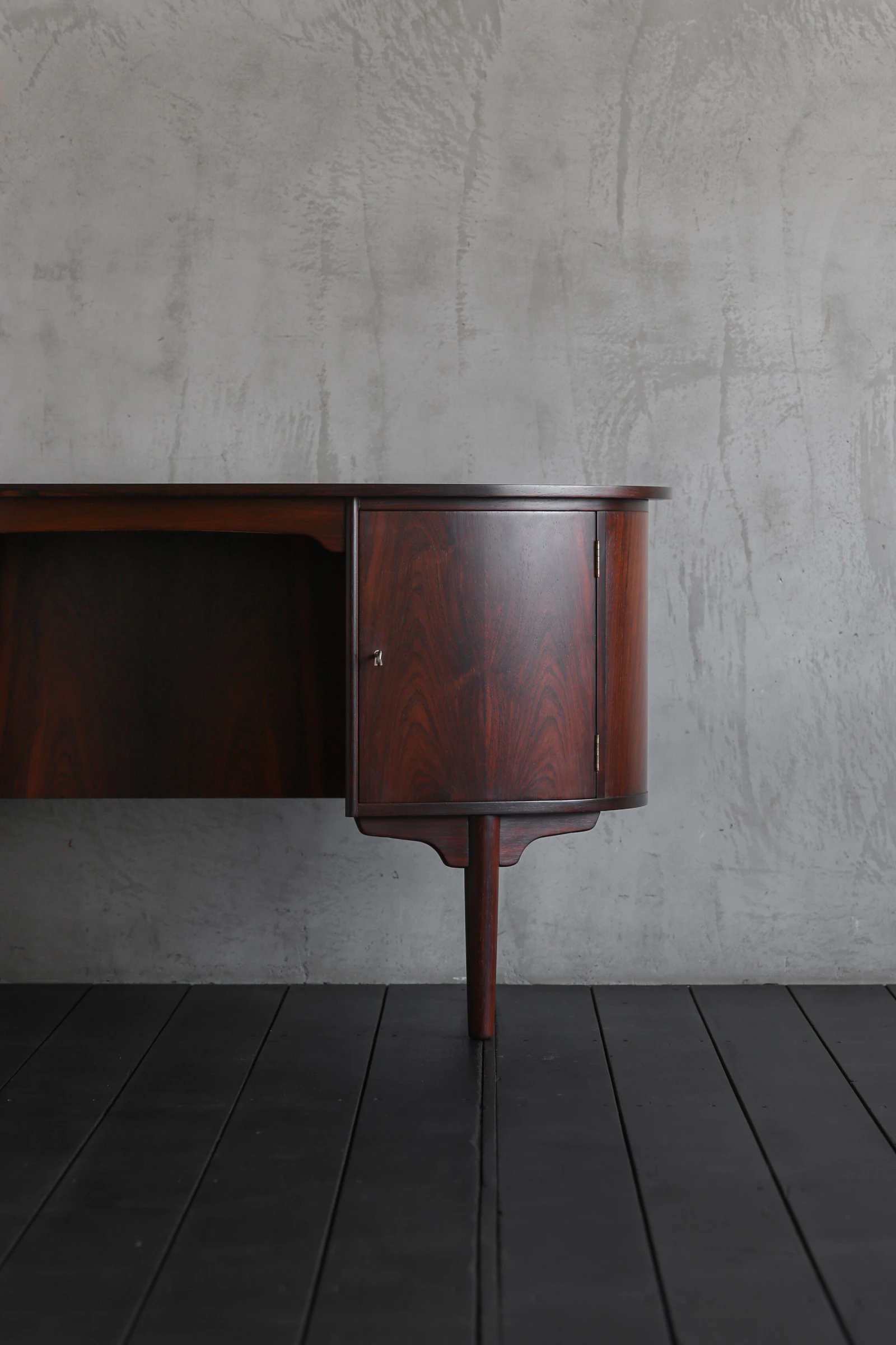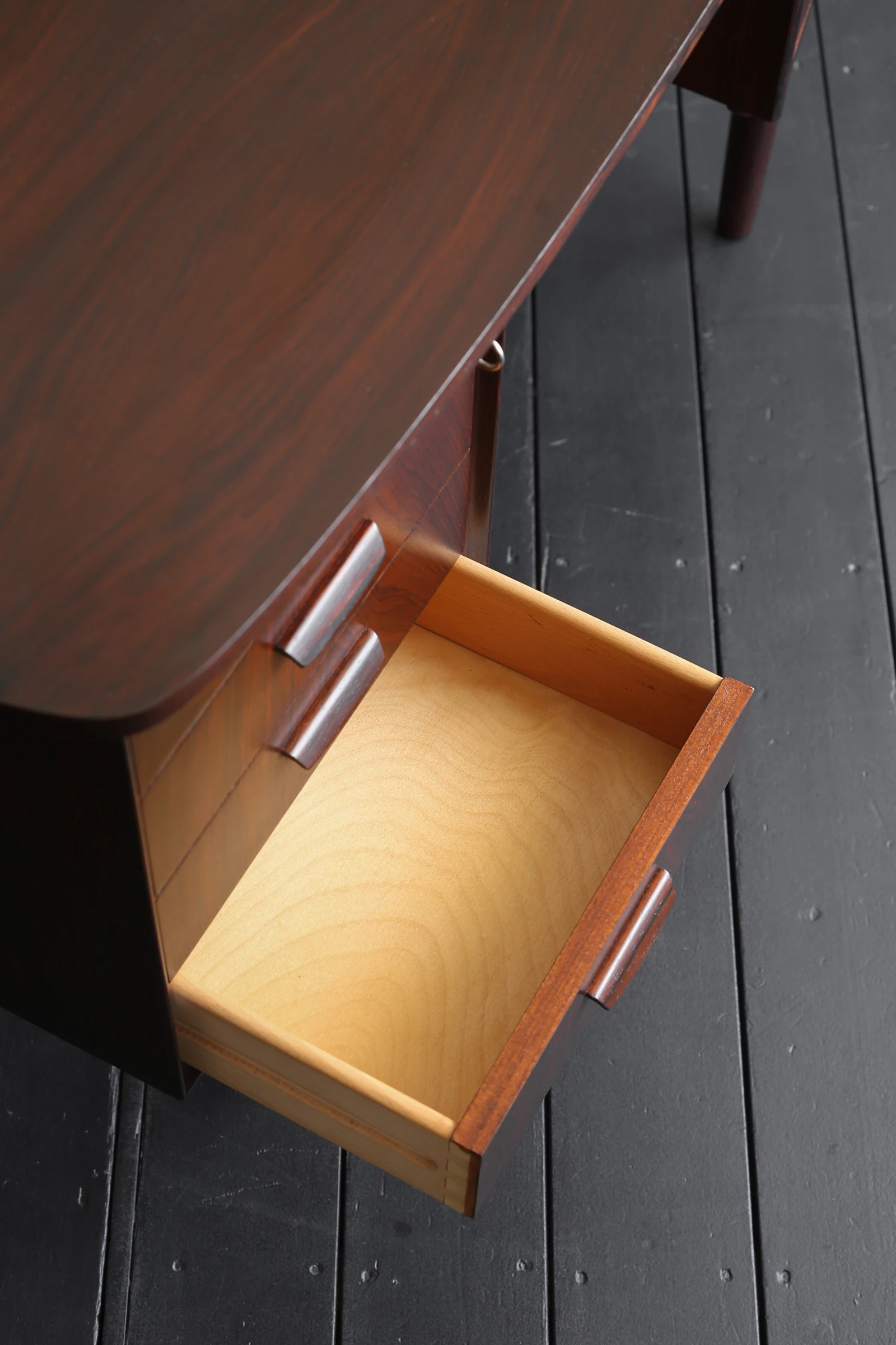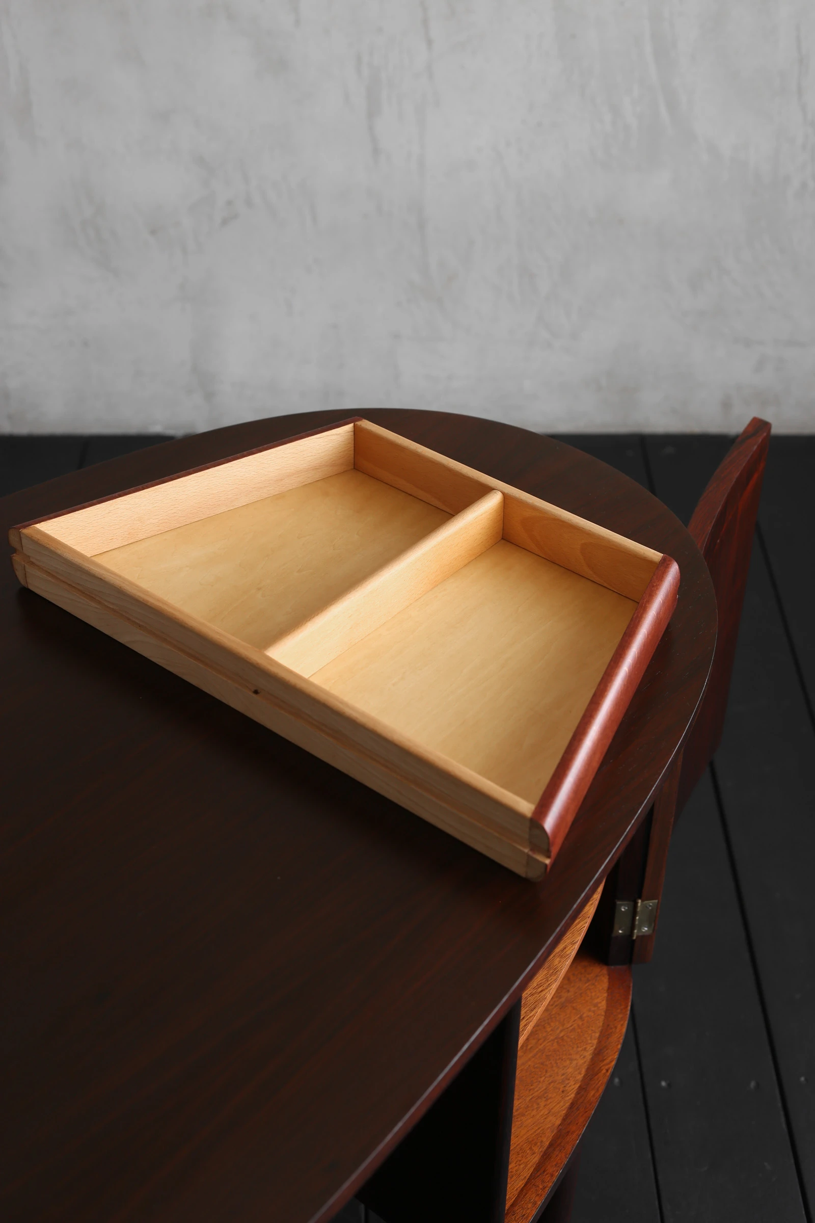 正面左側は引出が4杯、1段目は鍵がかけられる。正面右側の扉を開けると、裏扉からもアクセスできる浅い引出が一杯と棚板が1枚セットされた収納スペース、PC関連機器を上手に収納されてもいいかもしれない。裏側は可動棚がセットされたオープン棚、たっぷり書籍を収納できそうだ。裏面左側の扉は正面と通じ合っており、機能は先に述べた通り。現在では伐採禁止となったローズウッドを使用したデスクは希少性が高い一品。色艶が増した表情は気品さえ漂う。