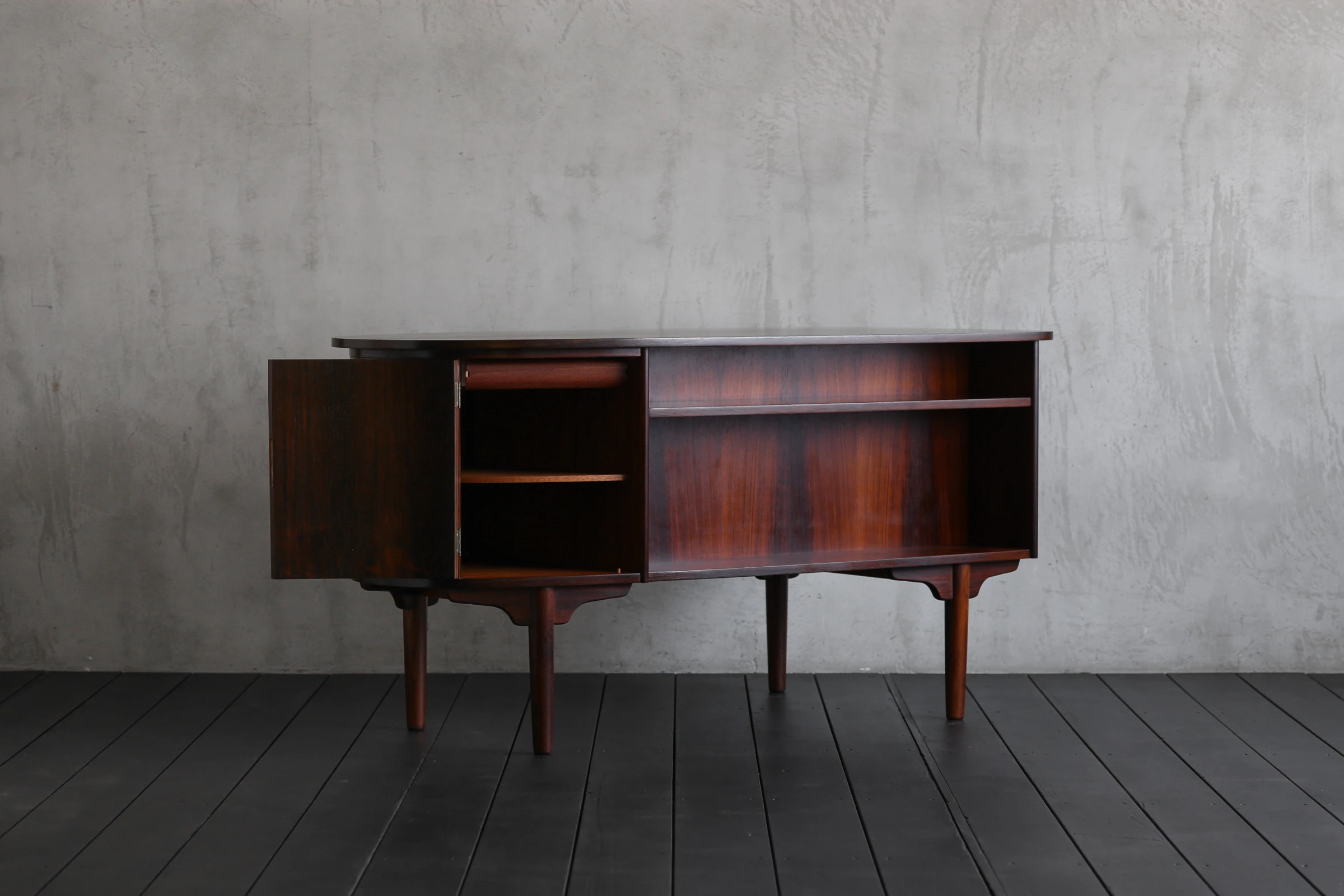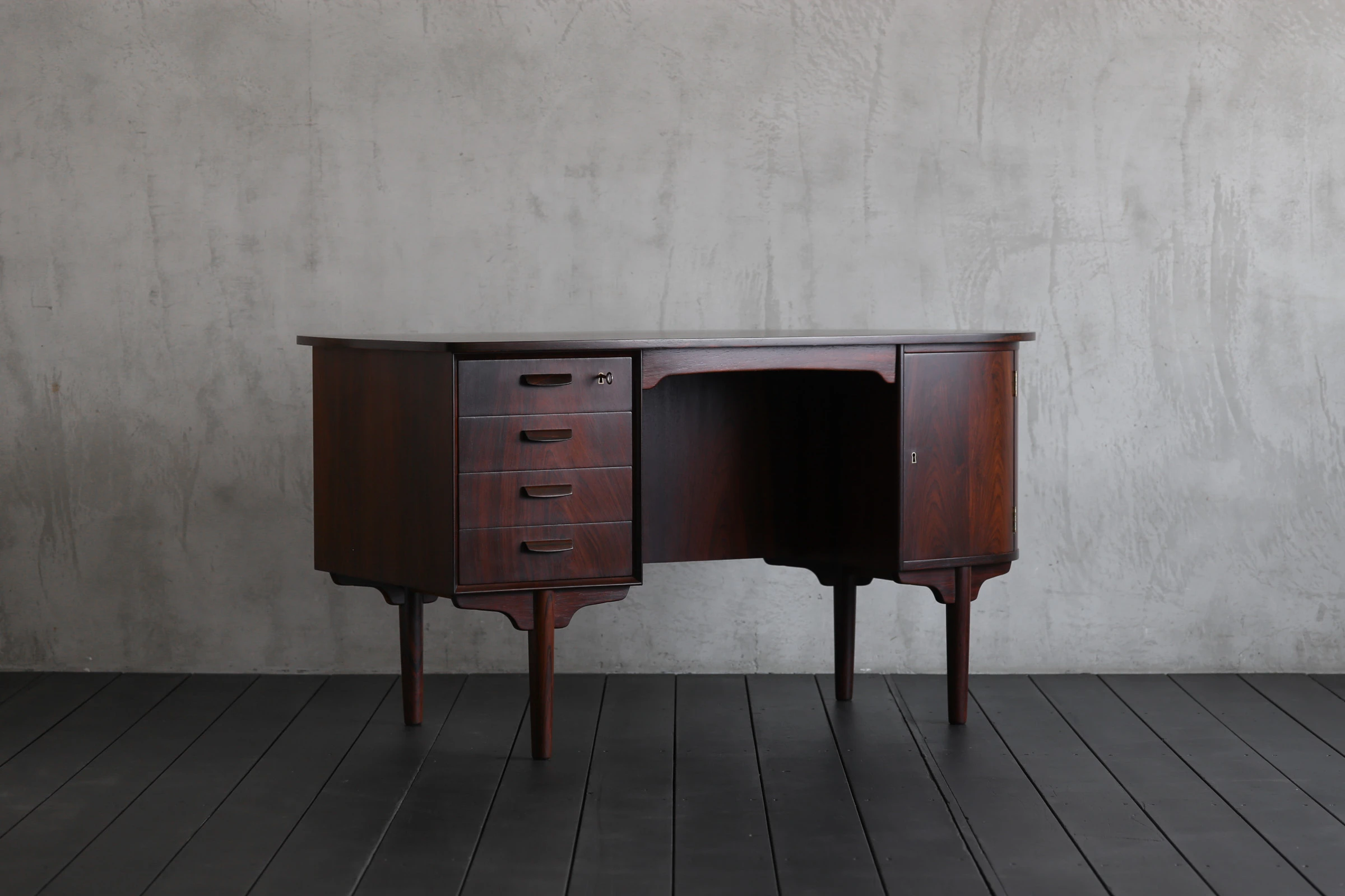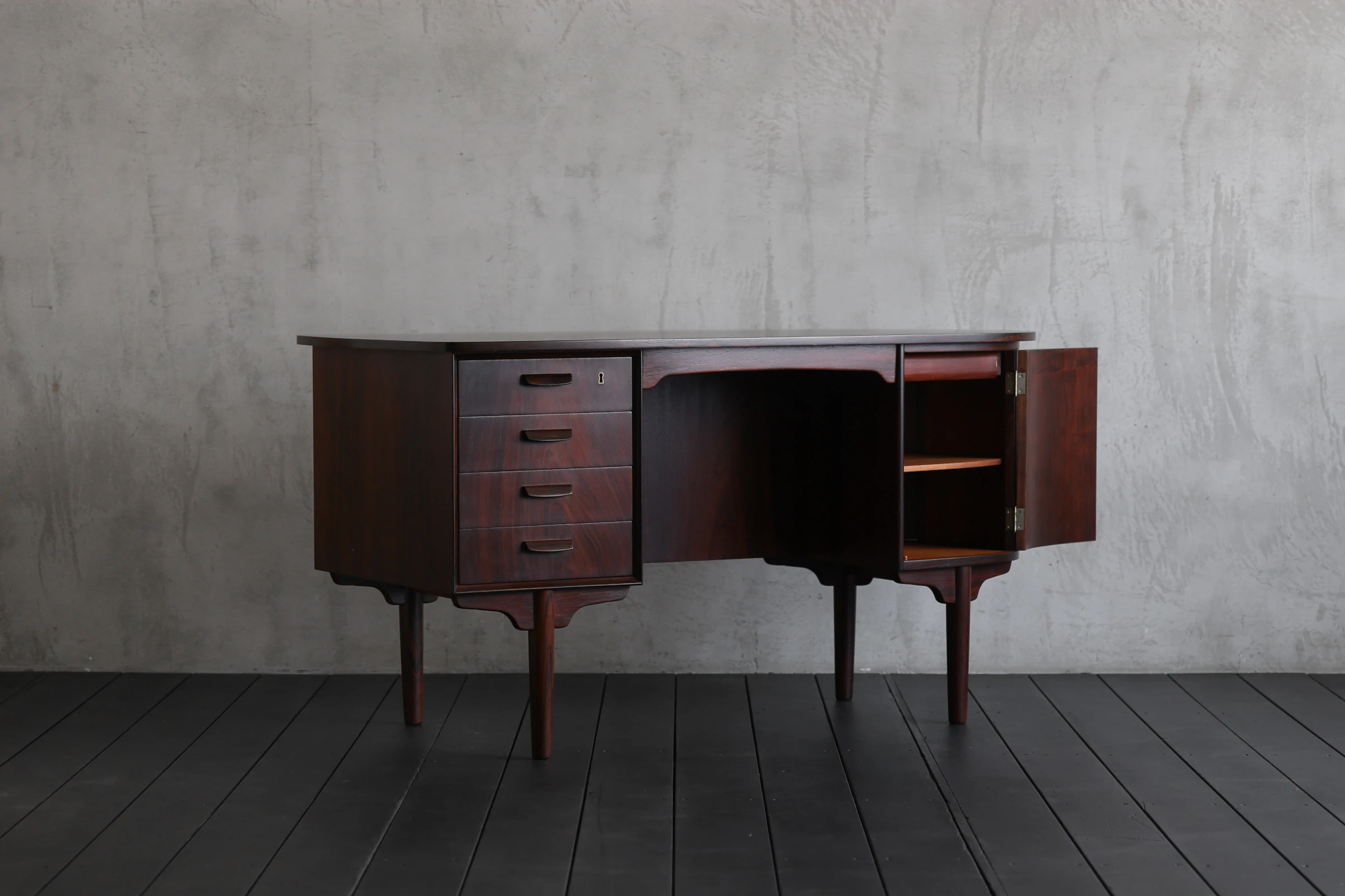 正面左側は引出が4杯、1段目は鍵がかけられる。正面右側の扉を開けると、裏扉からもアクセスできる浅い引出が一杯と棚板が1枚セットされた収納スペース、PC関連機器を上手に収納されてもいいかもしれない。裏側は可動棚がセットされたオープン棚、たっぷり書籍を収納できそうだ。裏面左側の扉は正面と通じ合っており、機能は先に述べた通り。現在では伐採禁止となったローズウッドを使用したデスクは希少性が高い一品。色艶が増した表情は気品さえ漂う。