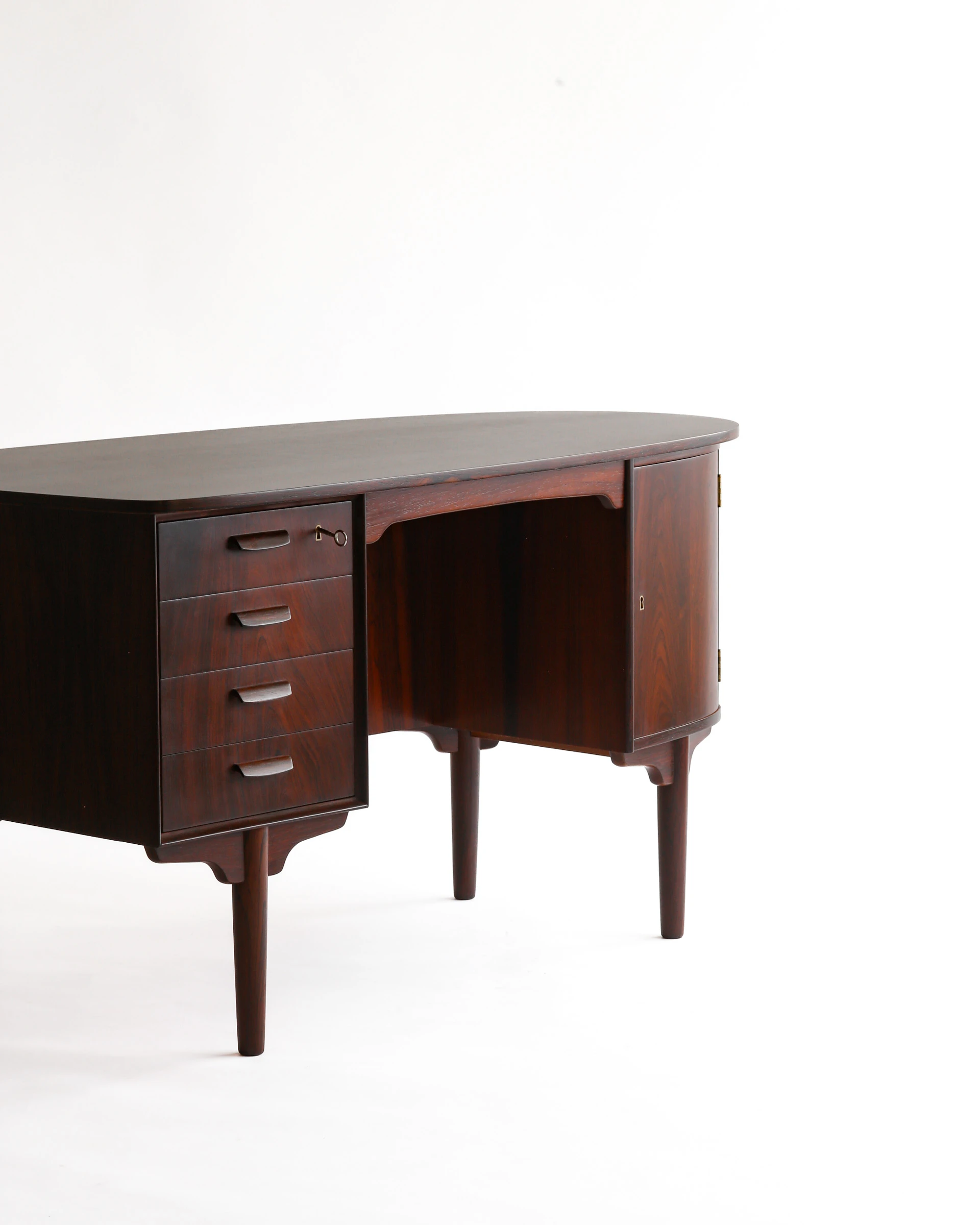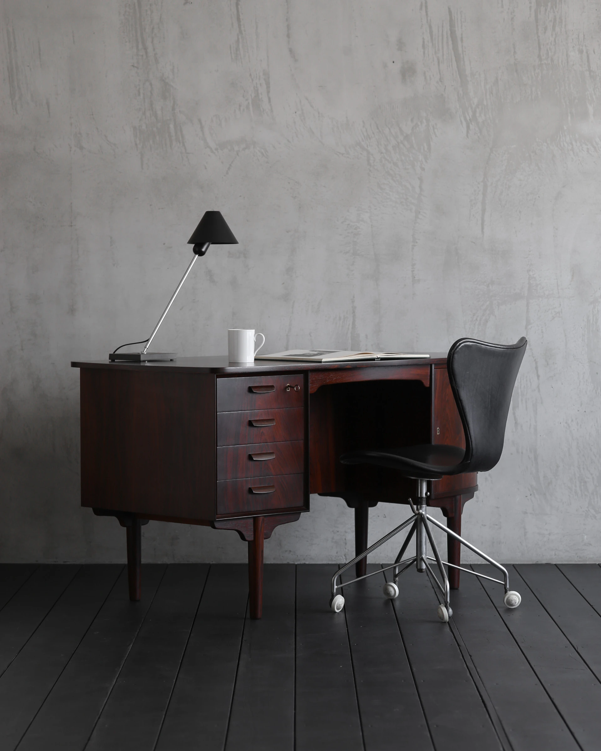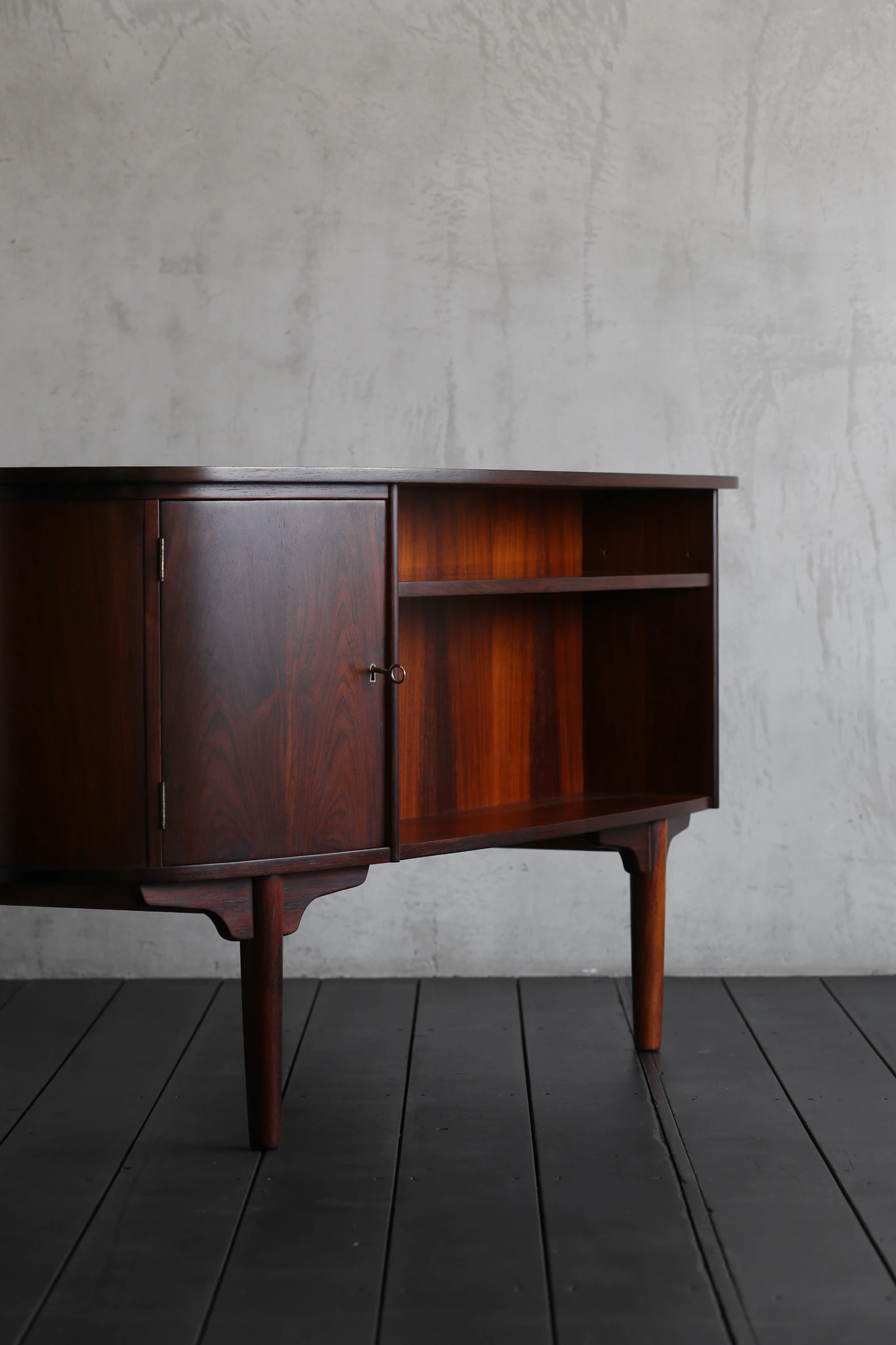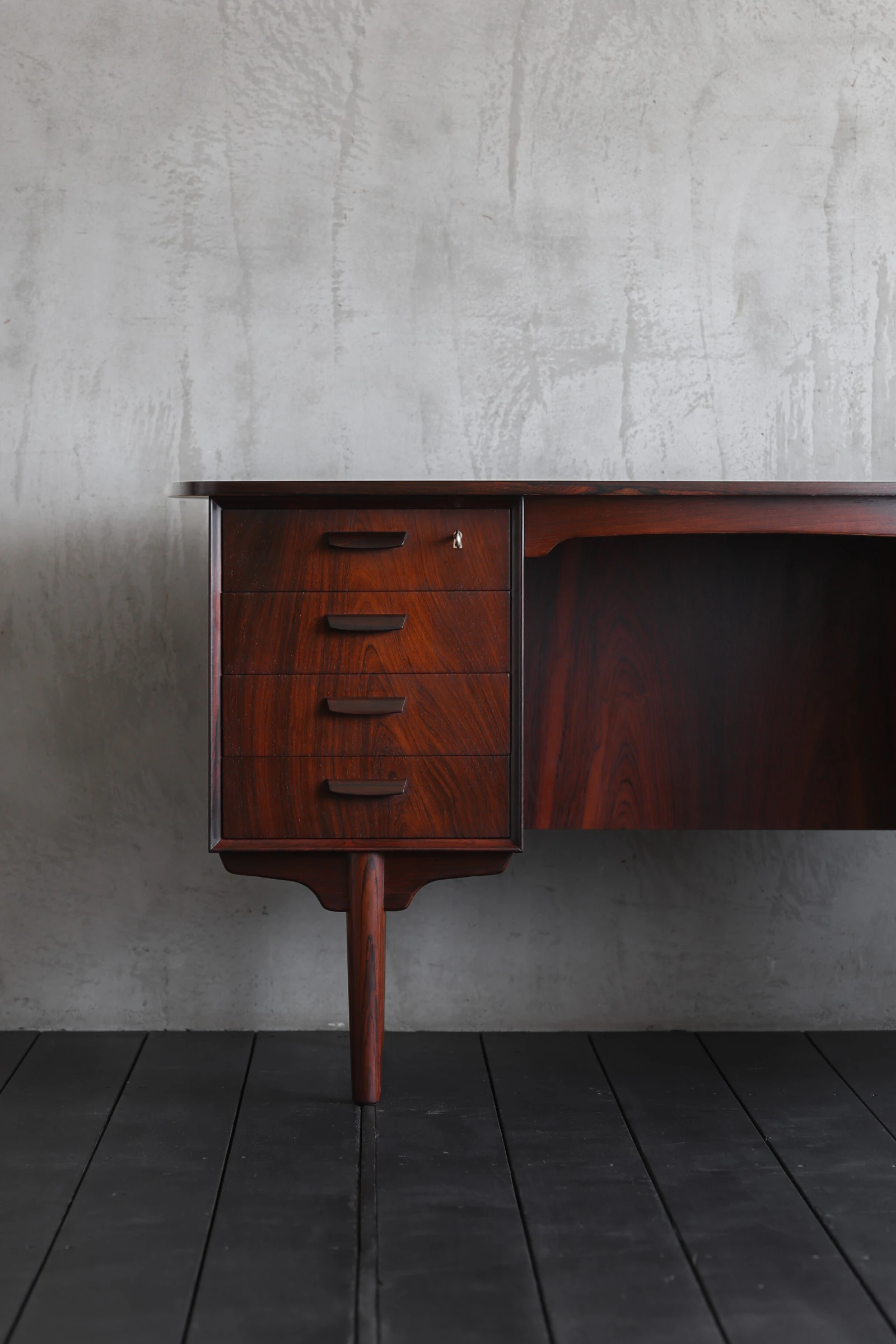 正面左側は引出が4杯、1段目は鍵がかけられる。正面右側の扉を開けると、裏扉からもアクセスできる浅い引出が一杯と棚板が1枚セットされた収納スペース、PC関連機器を上手に収納されてもいいかもしれない。裏側は可動棚がセットされたオープン棚、たっぷり書籍を収納できそうだ。裏面左側の扉は正面と通じ合っており、機能は先に述べた通り。現在では伐採禁止となったローズウッドを使用したデスクは希少性が高い一品。色艶が増した表情は気品さえ漂う。