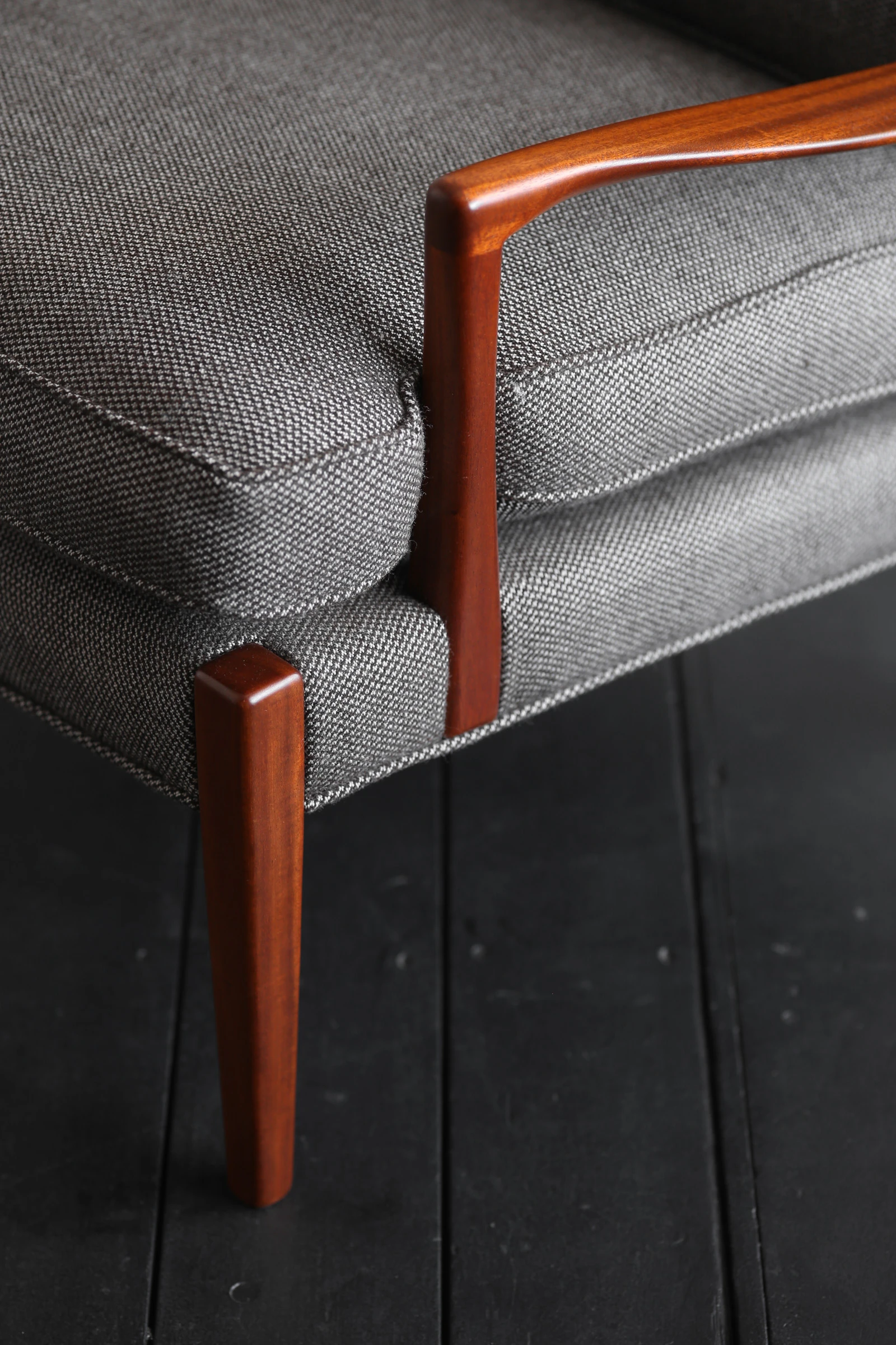 低めのシートに合わせて、アームの高さも設計されており、腕を乗せると肩の力がフッと抜ける感覚が味わえる。フレームが描く滑らかな曲線を指でなぞると、しっとりとした質感が心地よく、いつまでも触れていたくなってしまう。一般的には前脚とアームは1本の部材で繋がることが多いが、こちらはそれぞれが独立している。奥行をゆったりと持たせて安楽性を高めた際、掌が乗るポジションを計算し、アームをセットバックしたためだと思われるが、意匠的なインパクトもありユニークな造形だ。アームをかわすようにデザインされた座面のクッションも美しい納まり。疲れて帰ってきた体をゆったりと預け、晩酌や映画鑑賞など、思い思いの時間を快適に過ごすのにこの上ないパートナーとなるだろう。