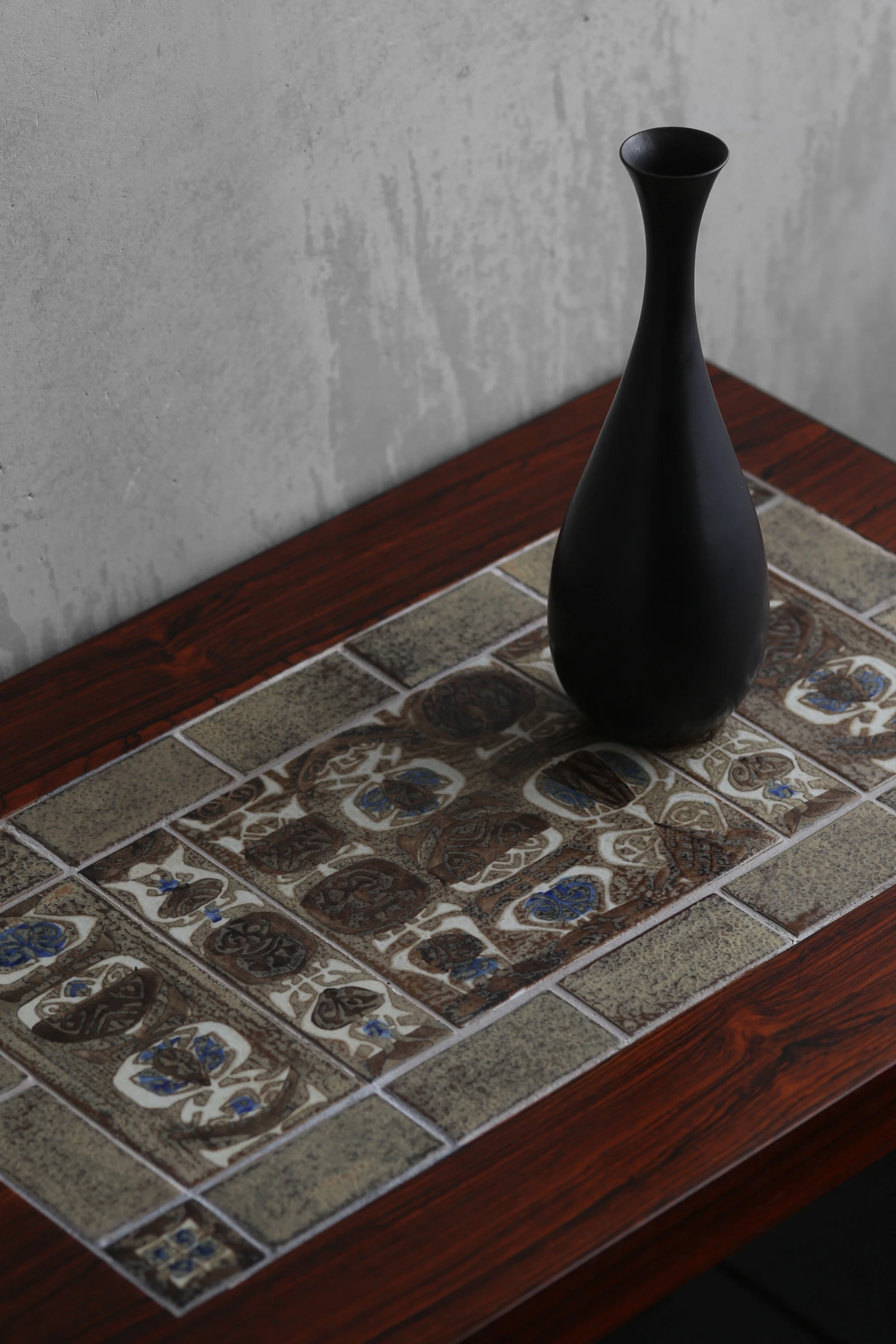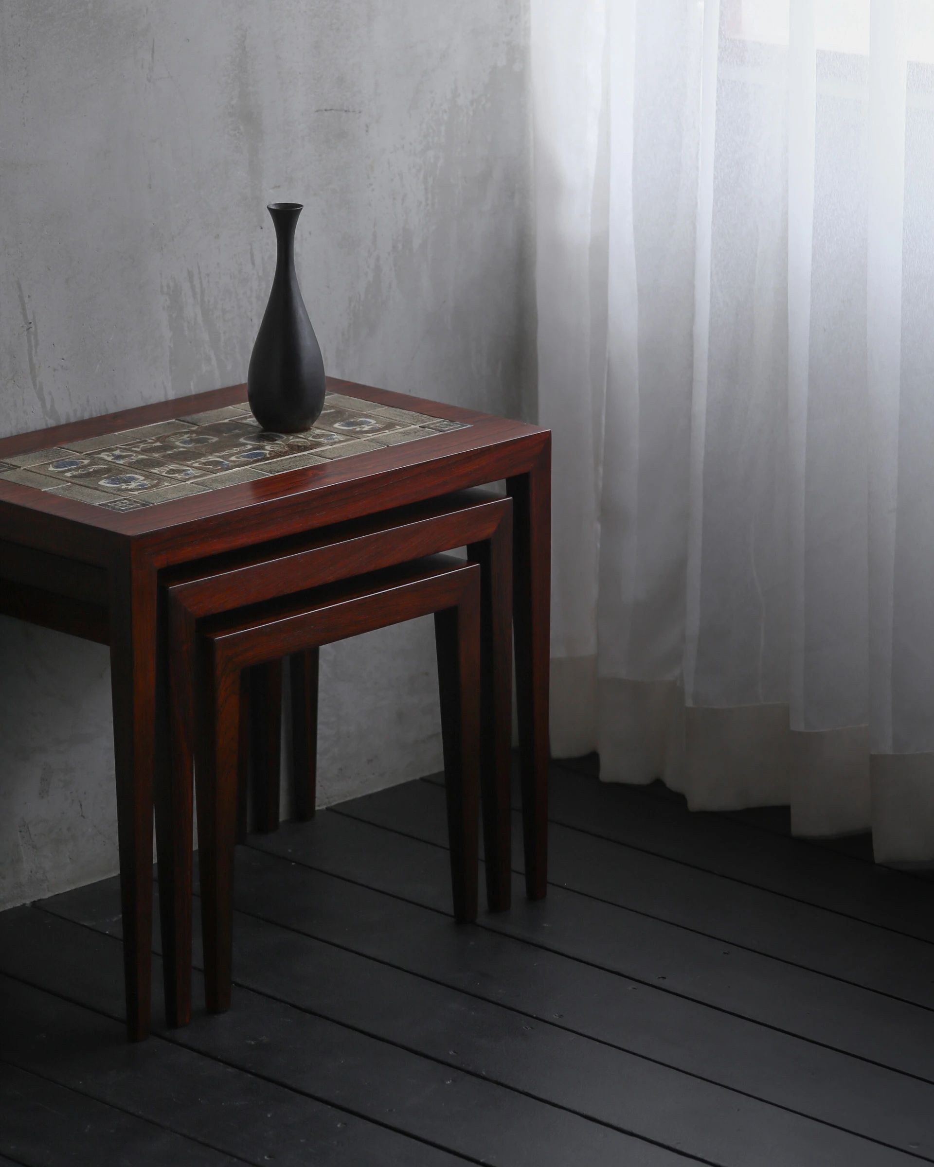 最も大きなテーブルに施されたタイル天板はRoyal Copenhagenのトップ絵付師Nils Thorsson(ニールス トーソン)が手がけた「BACA」というシリーズのもの。土の風合いを残した落ち着きのある色味をベースに、絶妙なグラデーションと繊細なハンドペイントで描かれた抽象的なデザインで見る者を魅了する。経年変化を経てより深みを増したローズウッドとの相性は抜群だ。