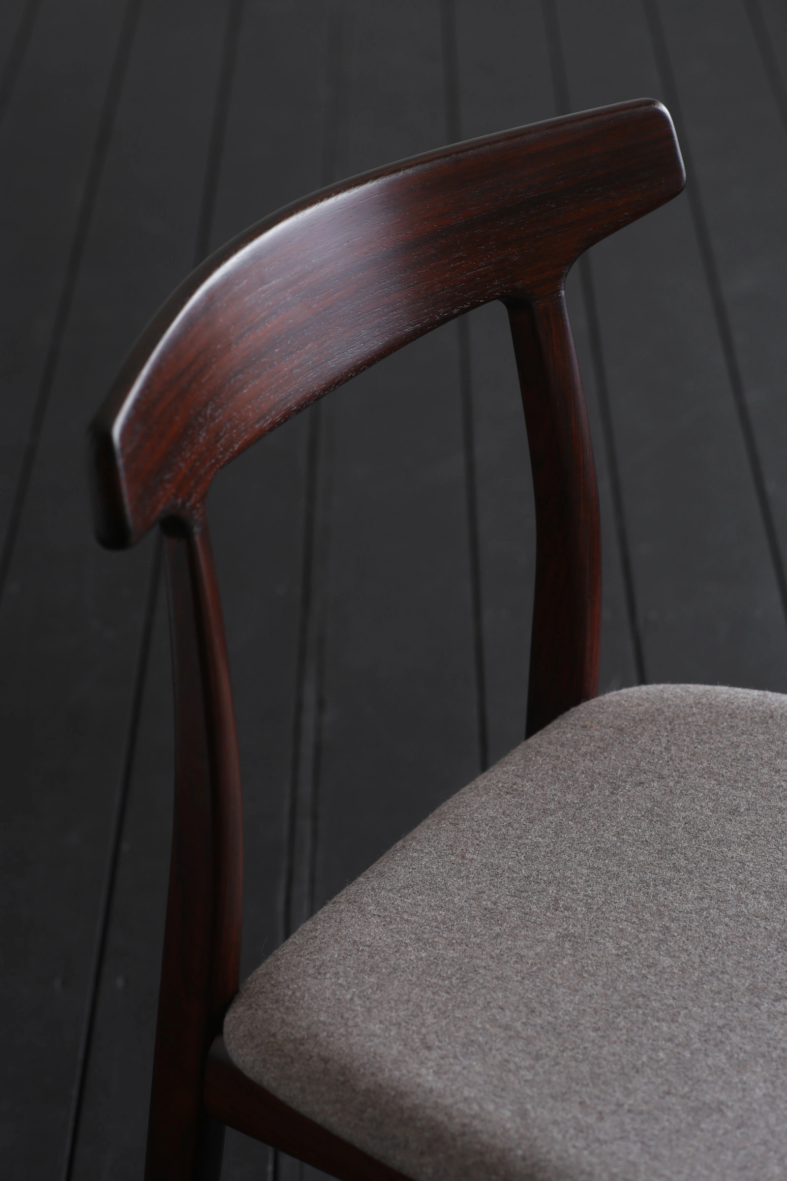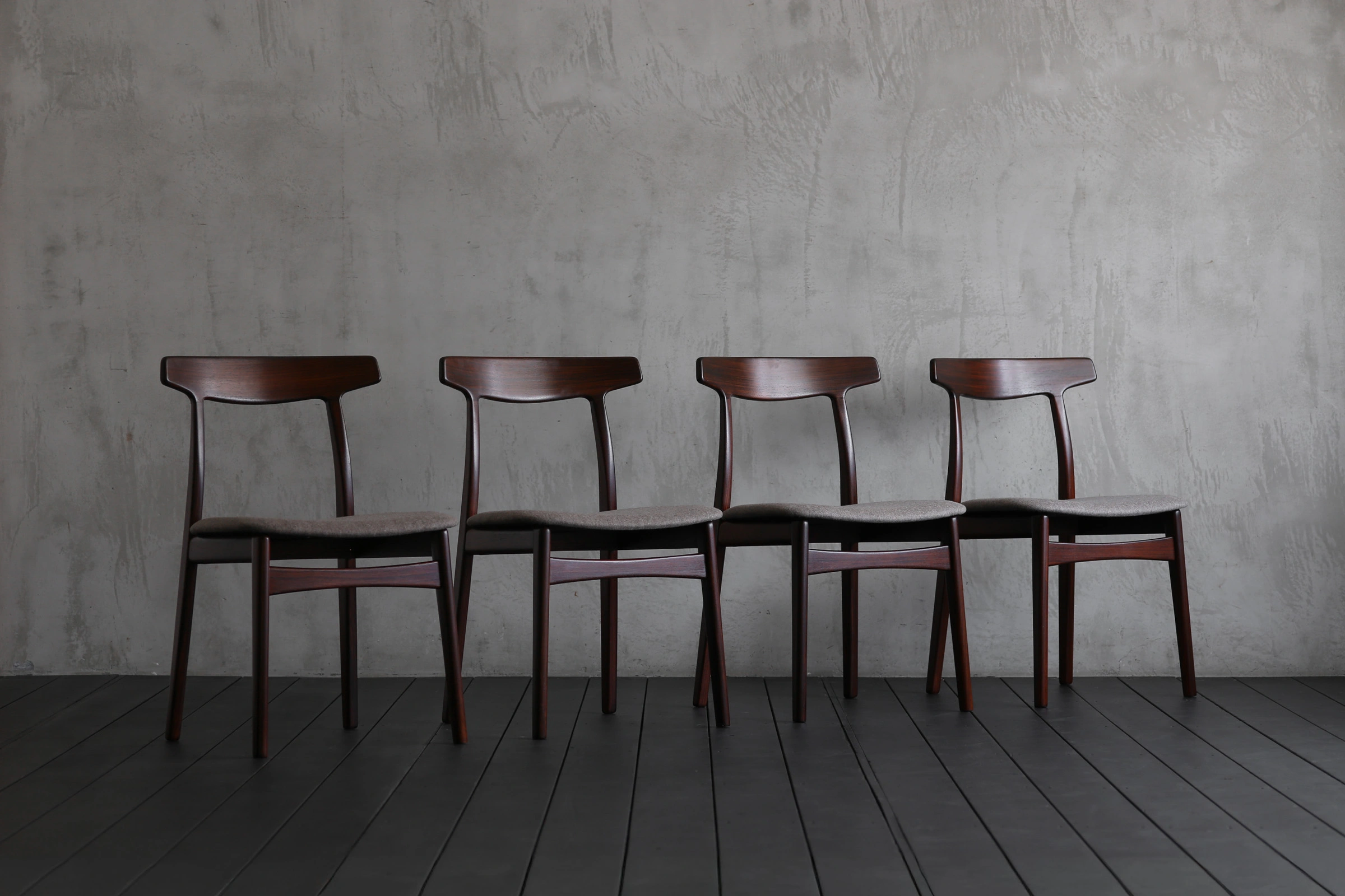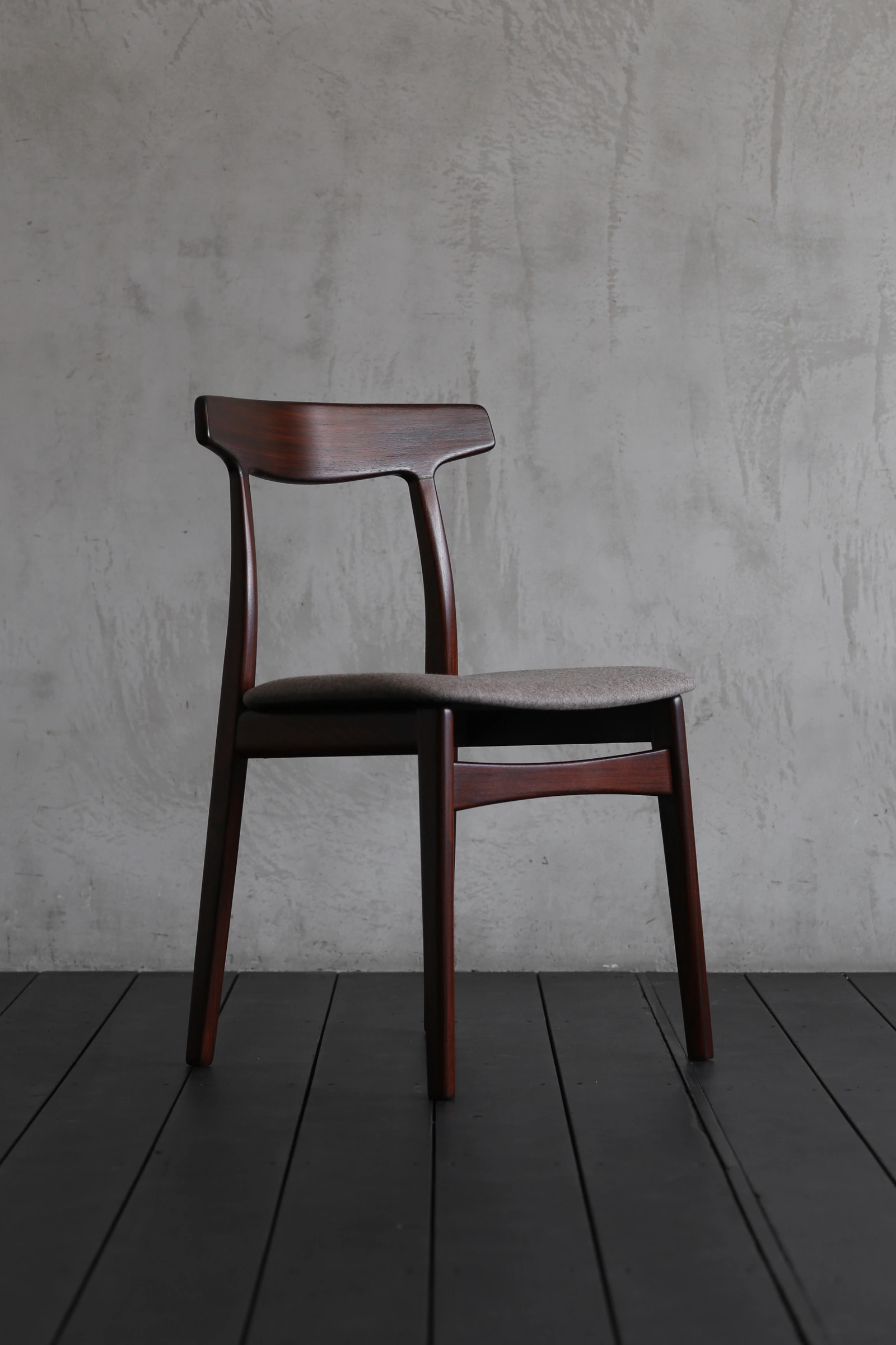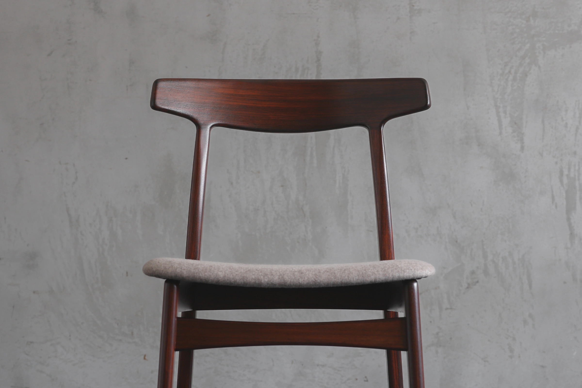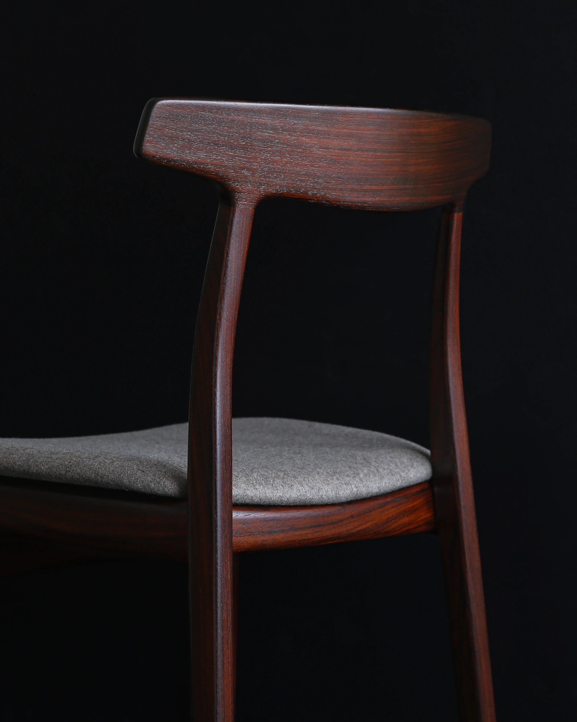 ローズウッド無垢材のみで構成されたフレームは、現在ではヴィンテージのみに許された贅沢。経年変化によって深みを増した漆のような色味は、このチェアの類稀なシルエットの美しさを際立たせる。背板から脚部へと流れるようにつながる接合部は非常に滑らかで美しく、当時の職人の高い技量だからこそなせる業。前方は貫を設け、堅牢性を確保しつつも、後方の貫を無くすことで背板から後ろ脚にかけての流麗なラインが浮かび上がる。そのため、テーブルにセットされた姿は凛とした空気感を放つ。