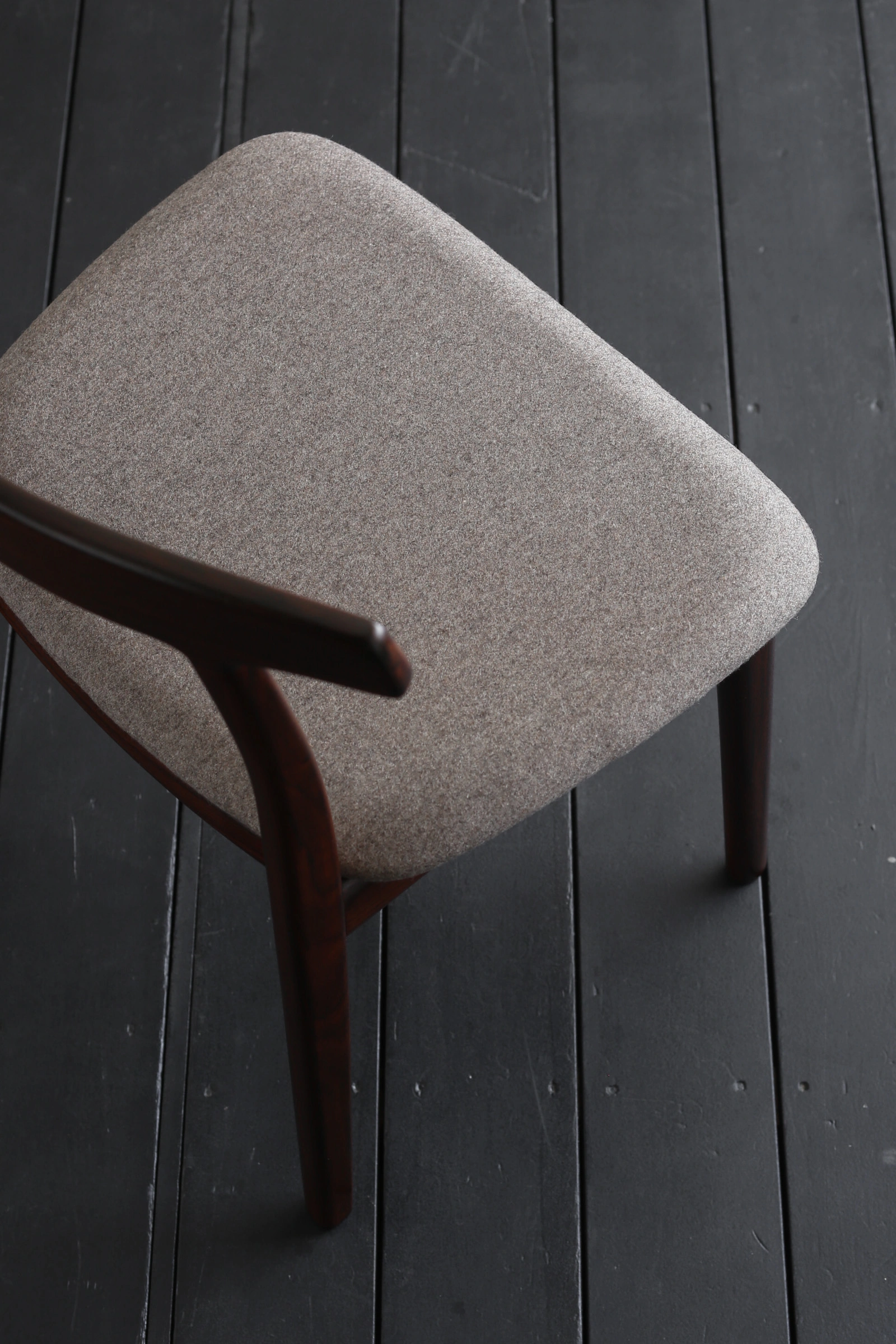 デンマークのデザイナー、Henning Kjaernulf(ヘニング・ケアヌルフ)によるダイニングチェア。これまで彼のダイニングテーブルは幾度となく紹介してきたが、チェアの入荷は珍しい。装飾に頼らず、素材と構造そのものの力強さで成立するデザインは、デンマーク家具らしい誠実さを湛えている。