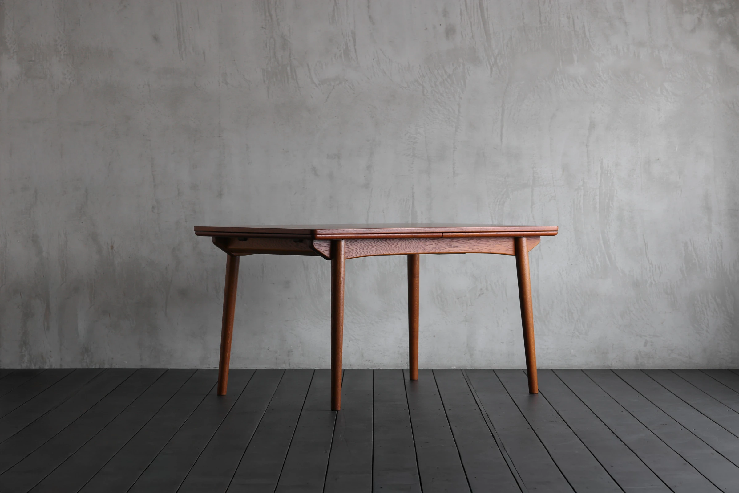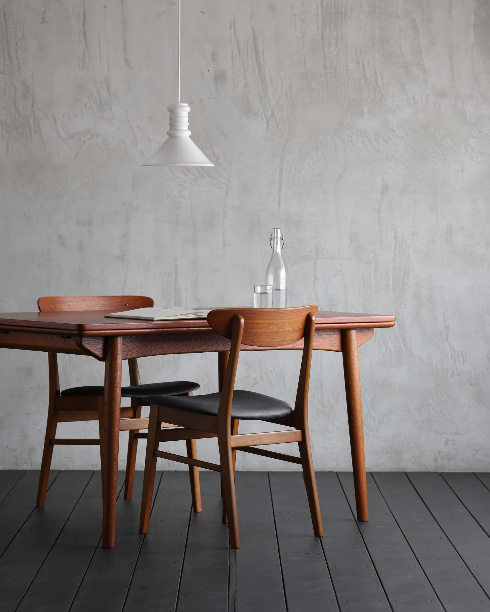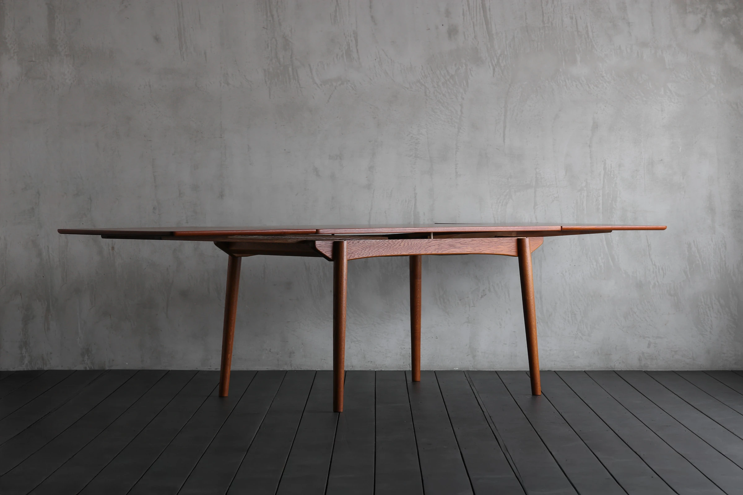 1960年代デンマーク製の拡張式テーブル。戦後のデンマークは都市部に人口が集中したことによる住宅不足によって、狭い間取りにファミリーで暮らしているケースも多く、そんな住宅事情を反映したこのテーブルは需要を見事に満たした。人々の生活に寄り添って生まれたプロダクトは機能的で、半世紀以上の月日が流れた今でも世界中で愛されている。