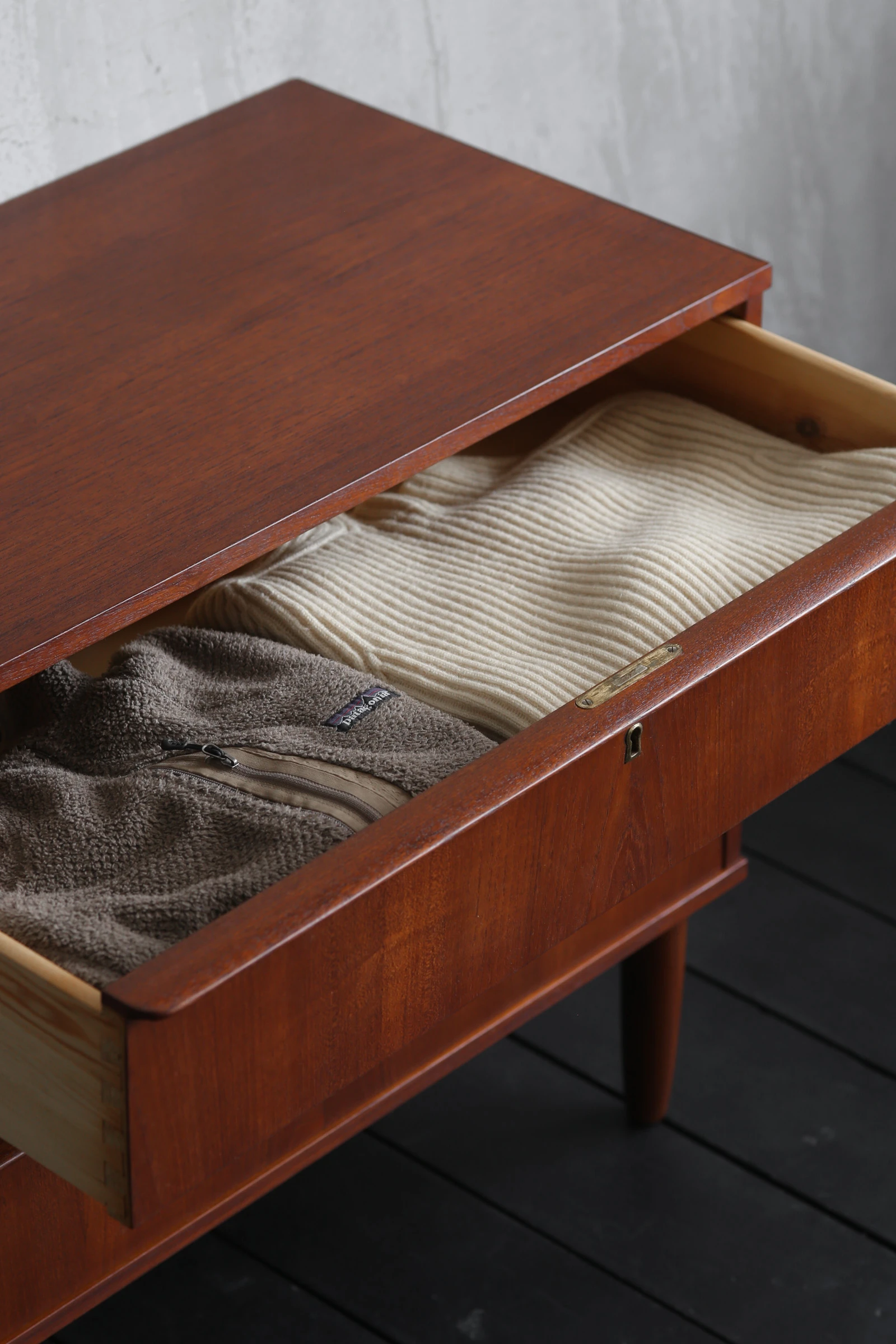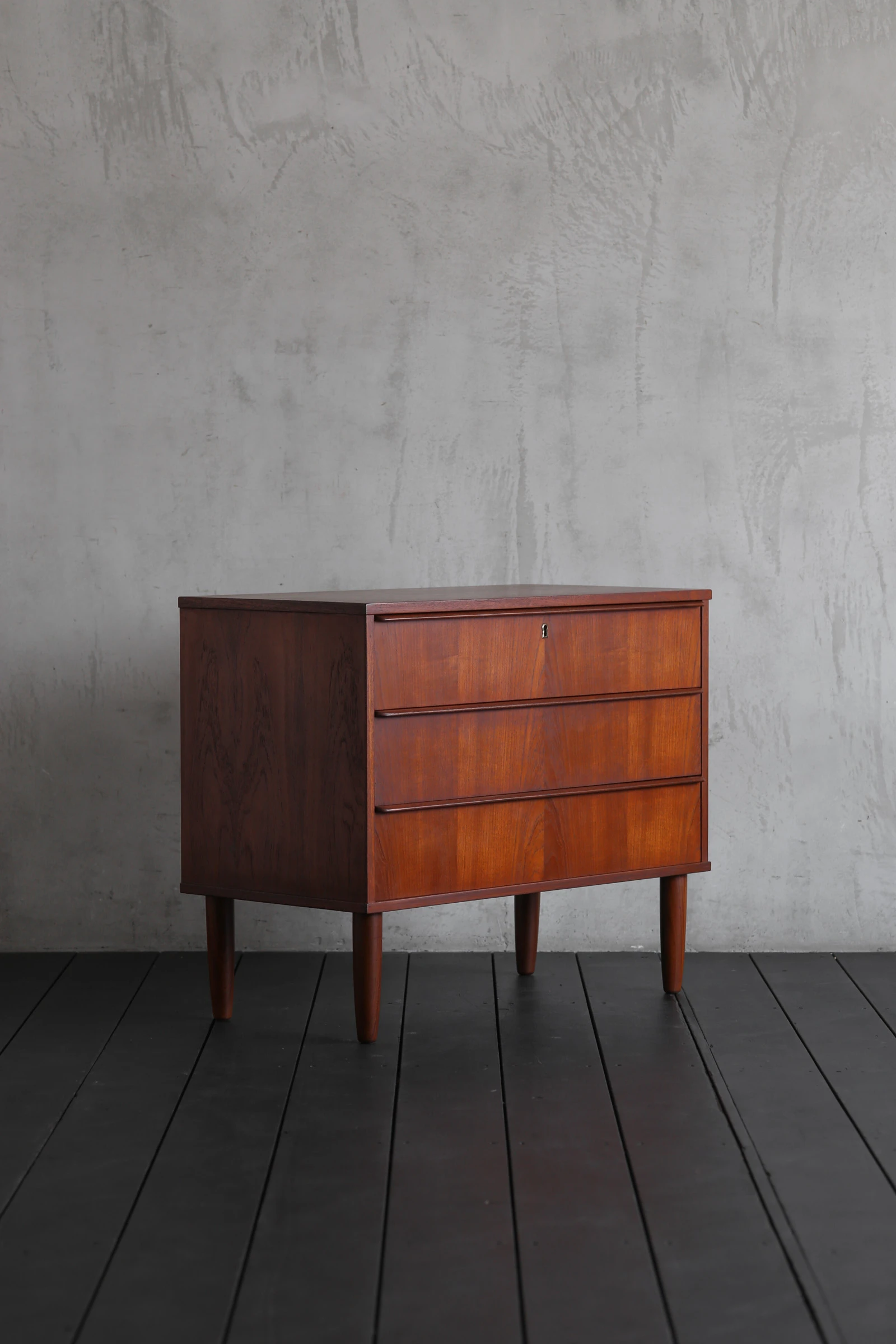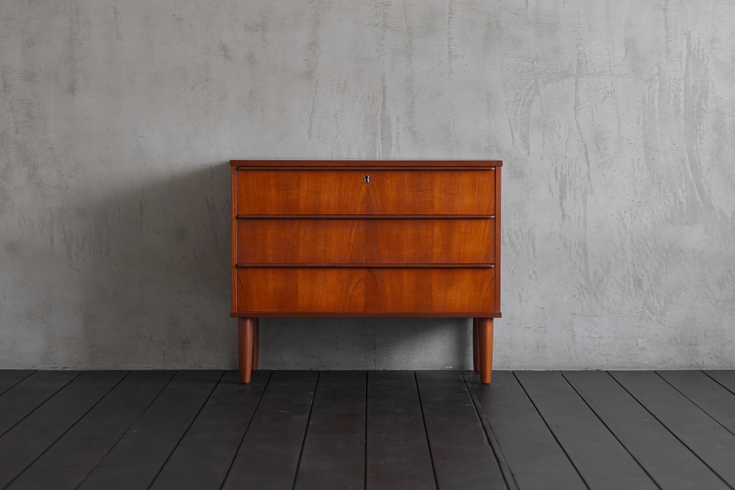 1960年代デンマーク製のチェスト。さぁ、ここに何を収めよう。収納家具としての機能性を考えれば高さを増して6段ぐらいで作るはずだから、敢えて3段に抑えている意図は他にある。きっと、壁面を広く確保することで解放感をだしたり、アートを飾ったりと、余白をユーザーに委ねているだろう。例えば、リビングやダイニングの一角に空いたちょっとしたスペースに置いて、チェストの上にはハーフサイズの鏡を掛けてみると、外出前の身だしなみスポットになりそうだ。引出しには車のキー、手袋、ハンカチ、或いは届いた郵送物の一時避難場所にするのもいい。テーブルの上がスッキリと過ごせそうだ。洋服をしまうチェストにしては小さく、ソファやベッドの脇に置くには少し大きい、そんなニッチなサイズだからこそ痒い所に手が届くことがある。自由な発想で使ってみて欲しい。