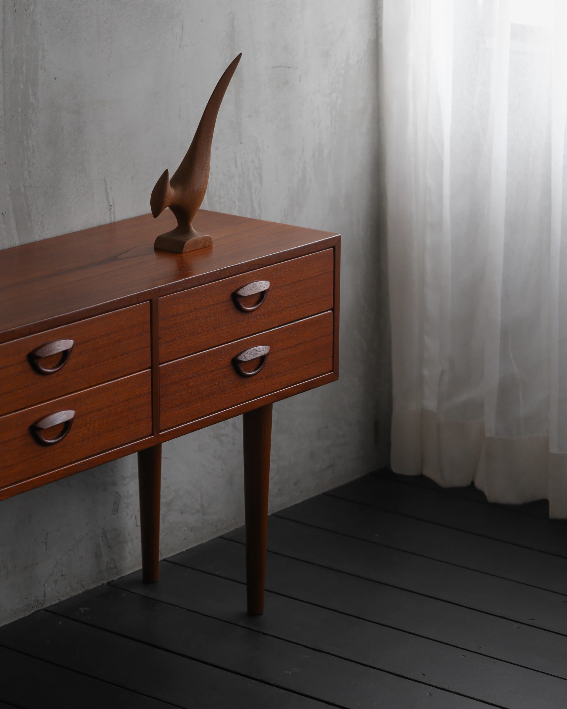それでは、このキャビネットについて話していこう。FMシステムという自身が手掛けたウォールユニットの流れを汲んだアイコニックなハンドル形状は、無垢材を丁寧に削りだした拘りの意匠。これを見れば、カイ・クリスチャンセンのデザインと分かるほどにシンボリックである。また、本体に対して長いテーパーレッグも本作の特徴的なところ。視線の抜けがもたらす余白感が上品なプロポーションを演出しており、所有する喜びを満たしてくれるに違いない。