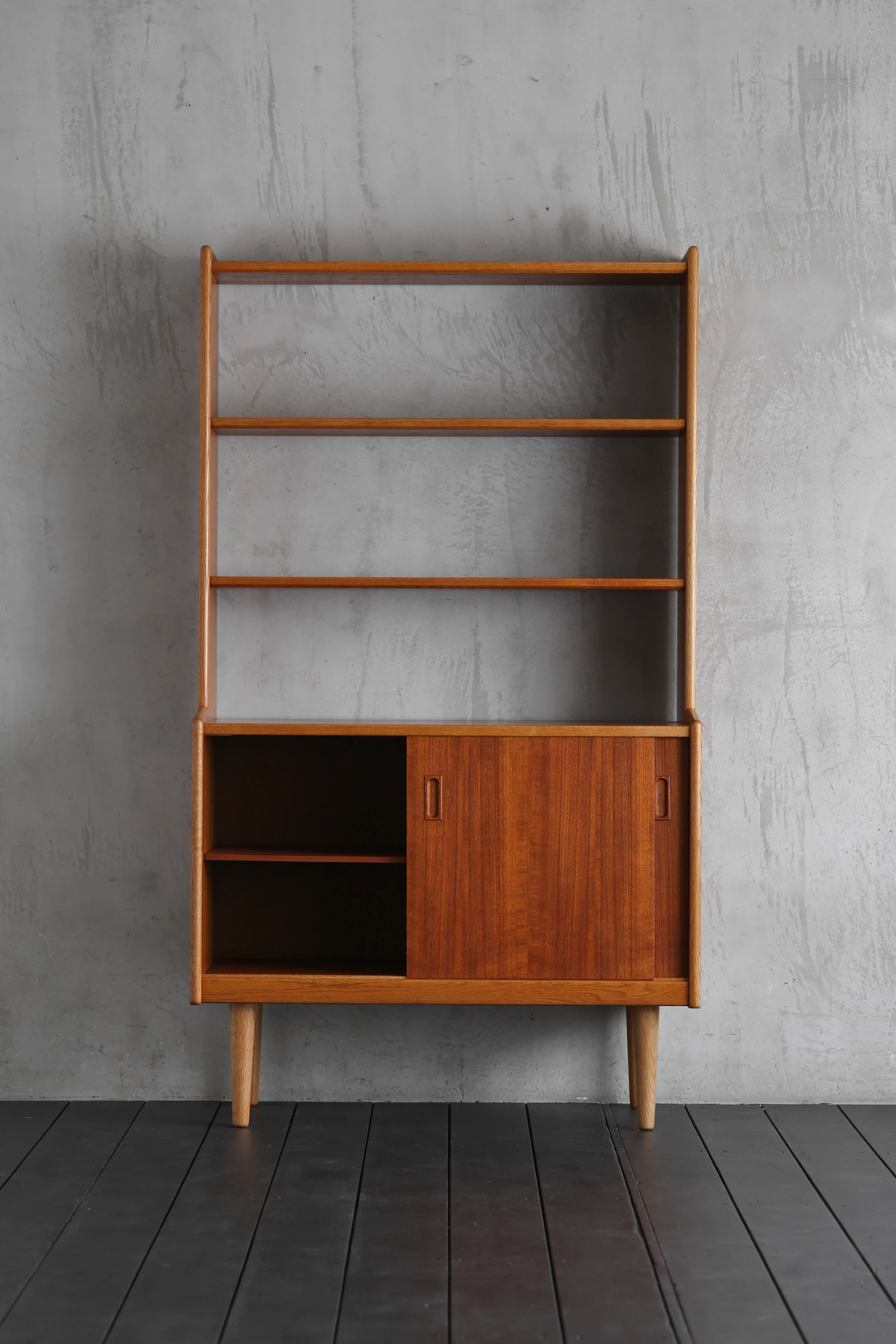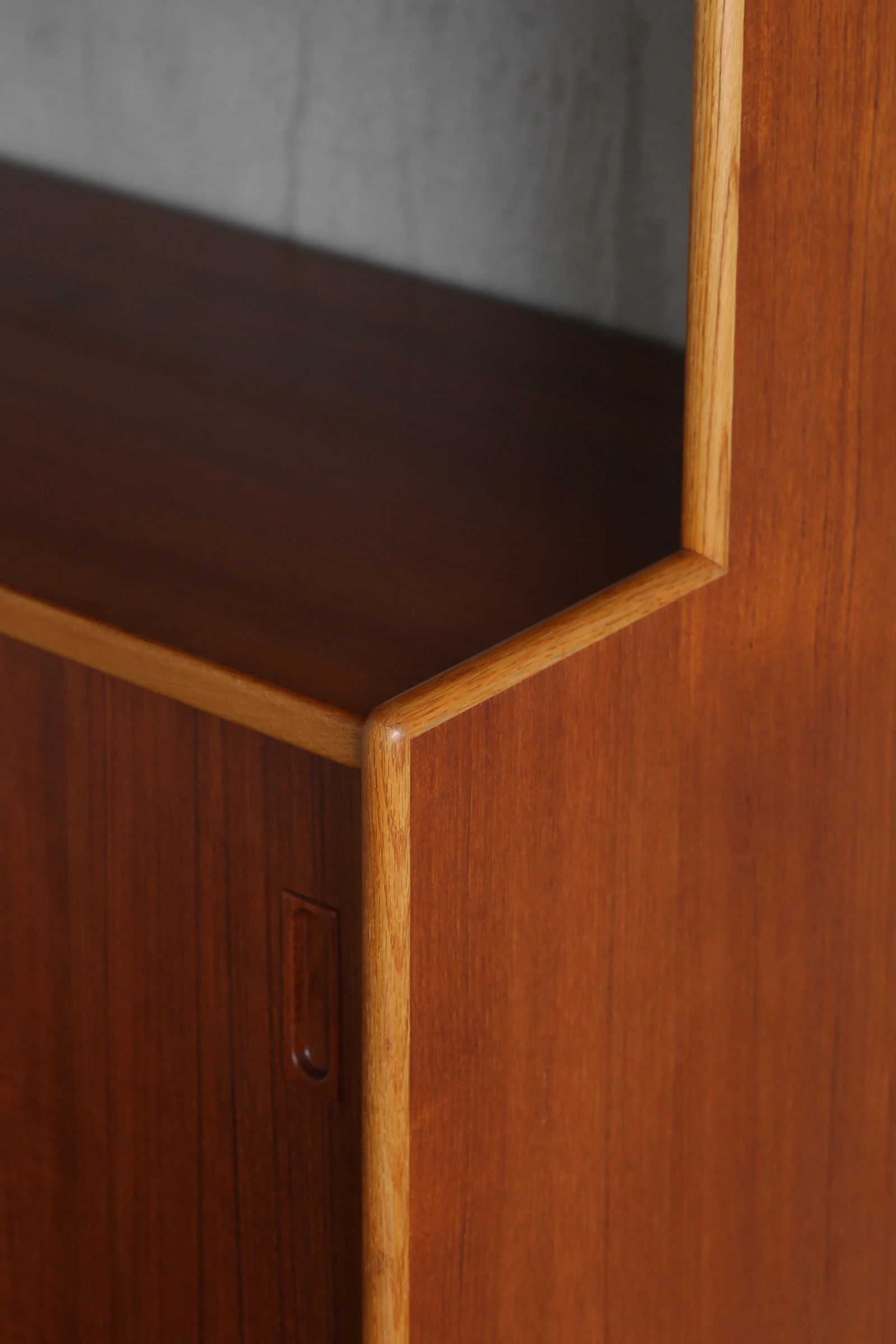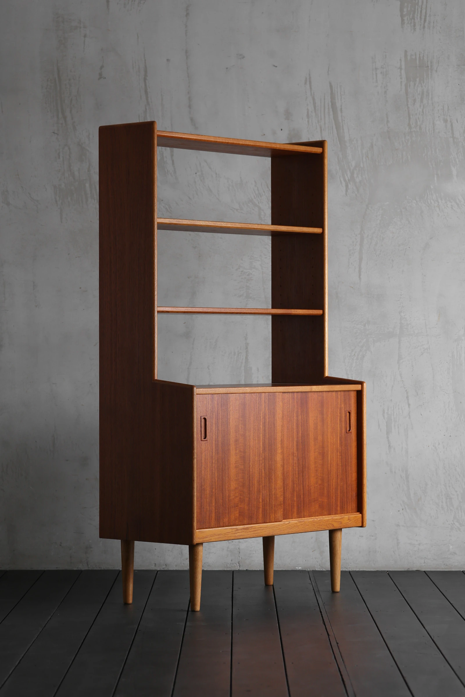 1960年代デンマーク製のオープンシェルフといえば背板がなく軽快さが取り柄。部屋の壁がキャビネットの一部になる為、背が高い家具なのにレイアウト性は優れている。上段の本棚は下段に対してセットバックしているのも効いているのだろう。だから、棚を本で埋めるよりも、隙間から壁を覗かせるくらいの余白を残して書籍やオブジェを飾るように並べるといい。軽やかさが保たれる。