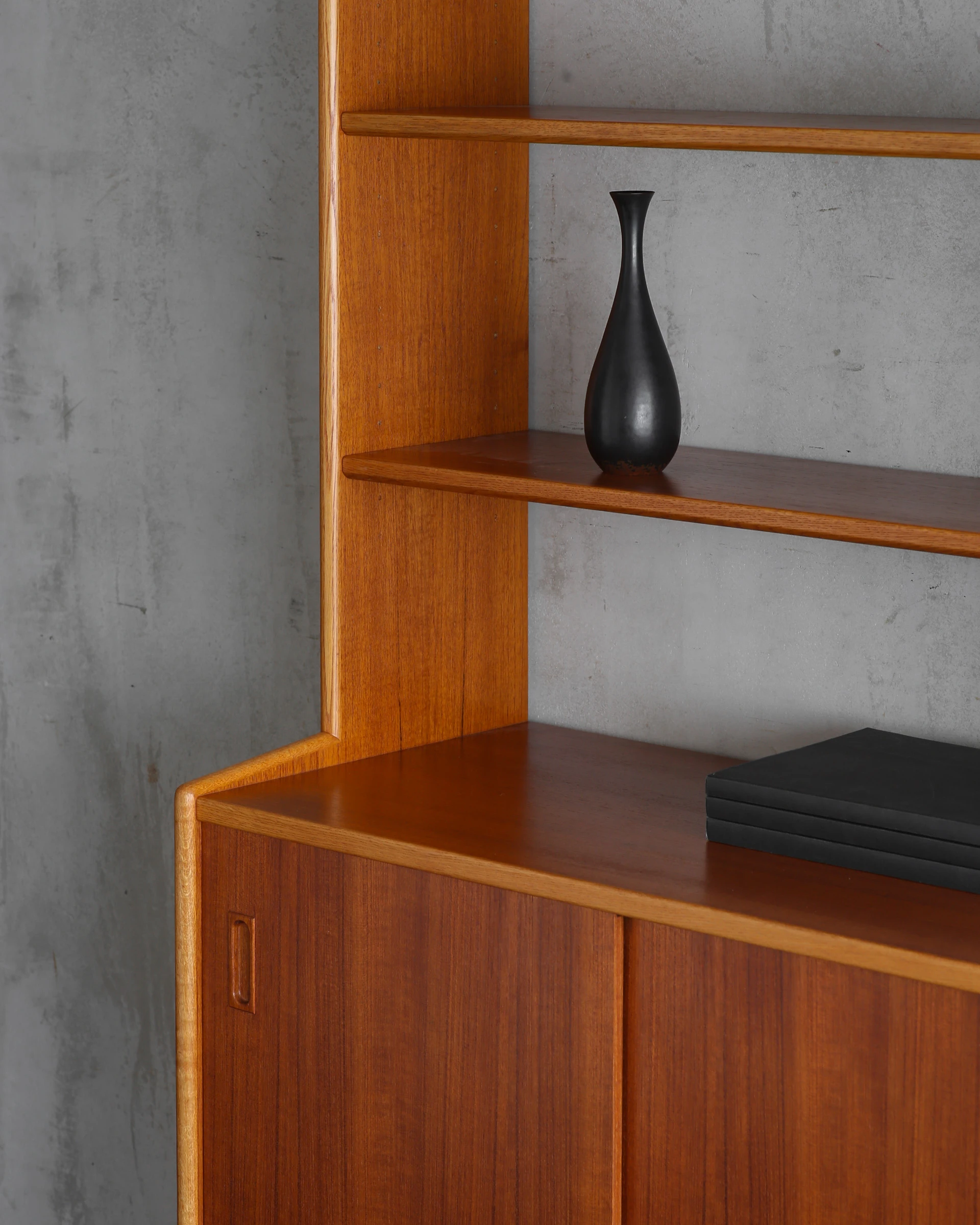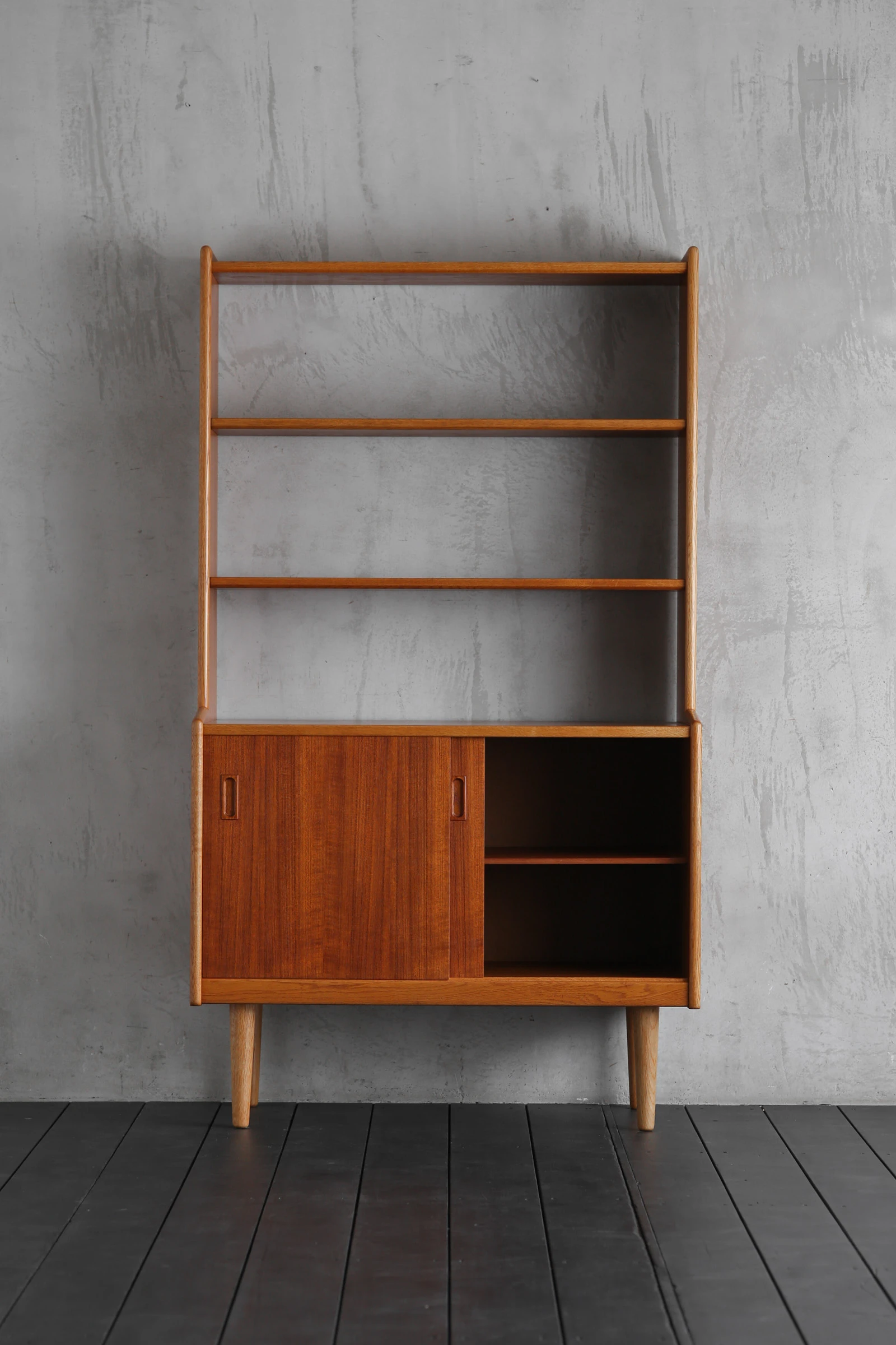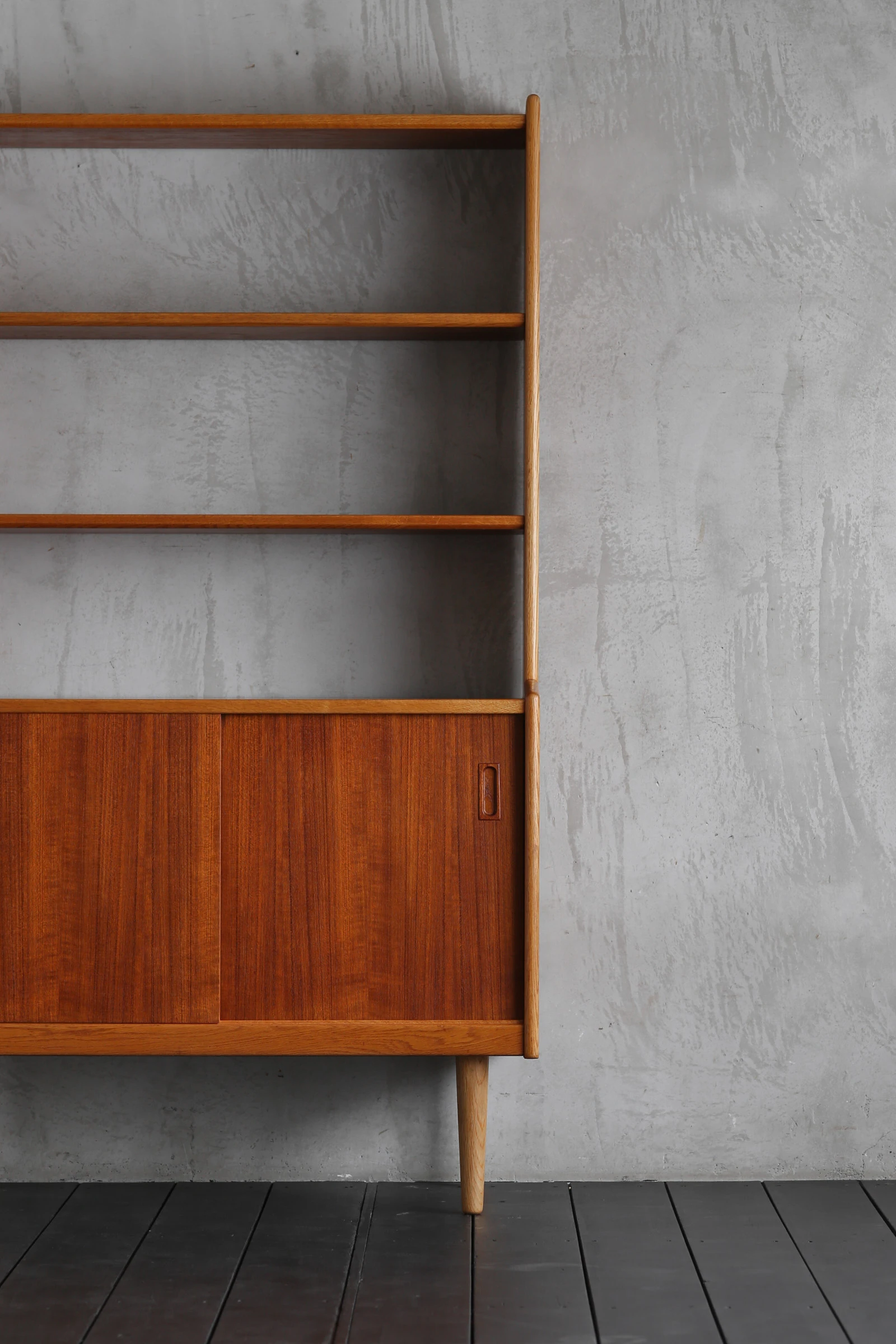 1960年代デンマーク製のオープンシェルフといえば背板がなく軽快さが取り柄。部屋の壁がキャビネットの一部になる為、背が高い家具なのにレイアウト性は優れている。上段の本棚は下段に対してセットバックしているのも効いているのだろう。だから、棚を本で埋めるよりも、隙間から壁を覗かせるくらいの余白を残して書籍やオブジェを飾るように並べるといい。軽やかさが保たれる。