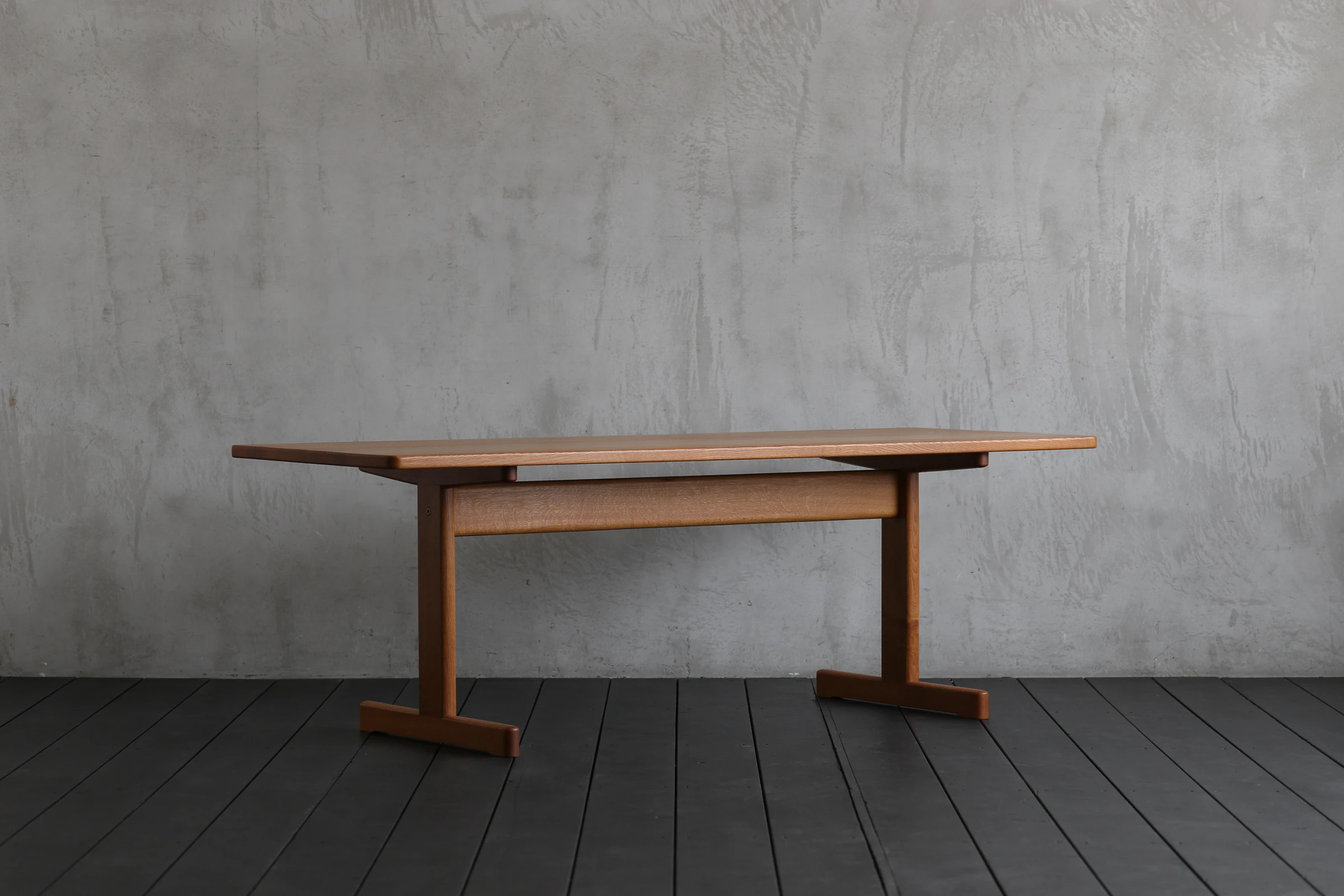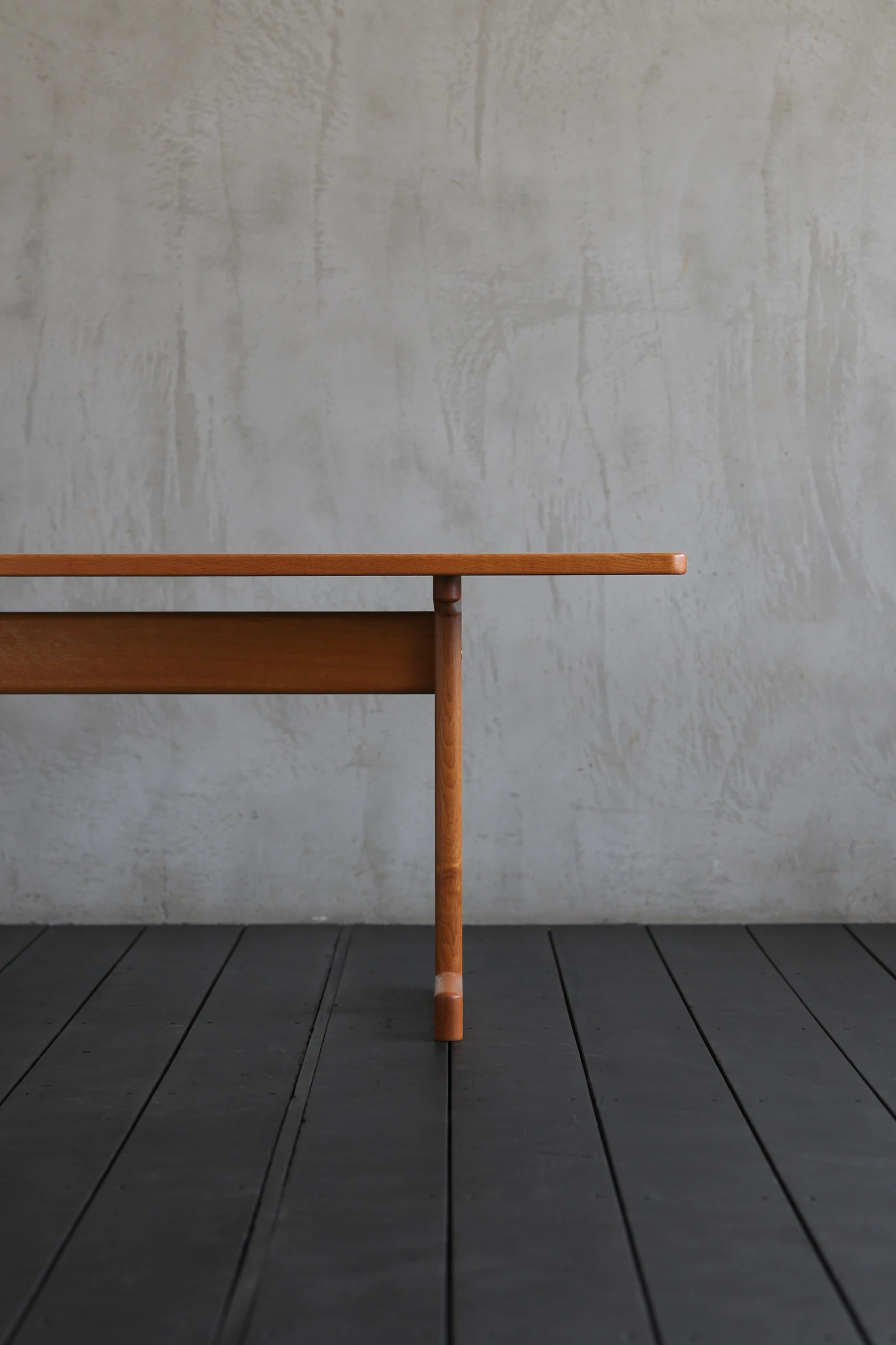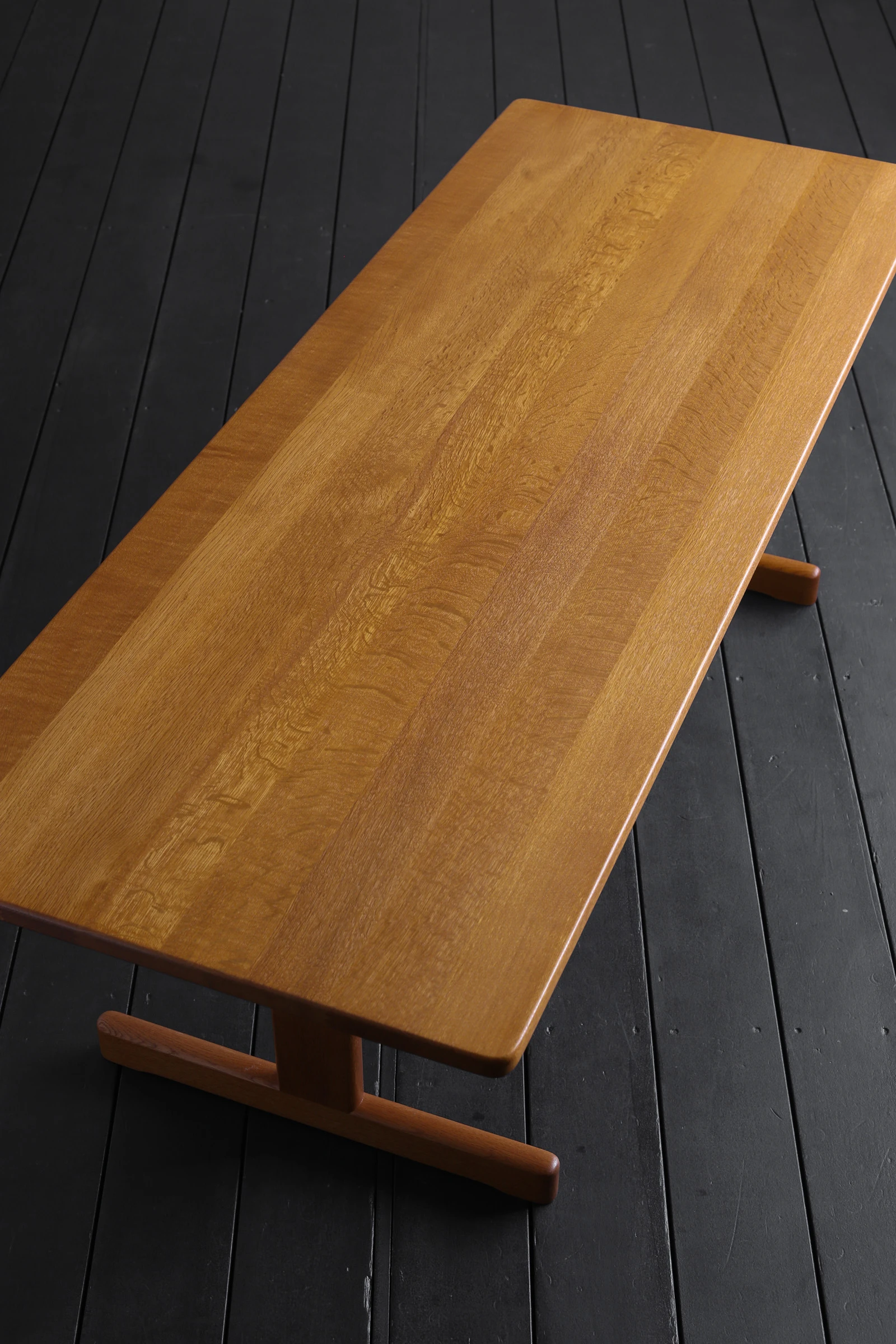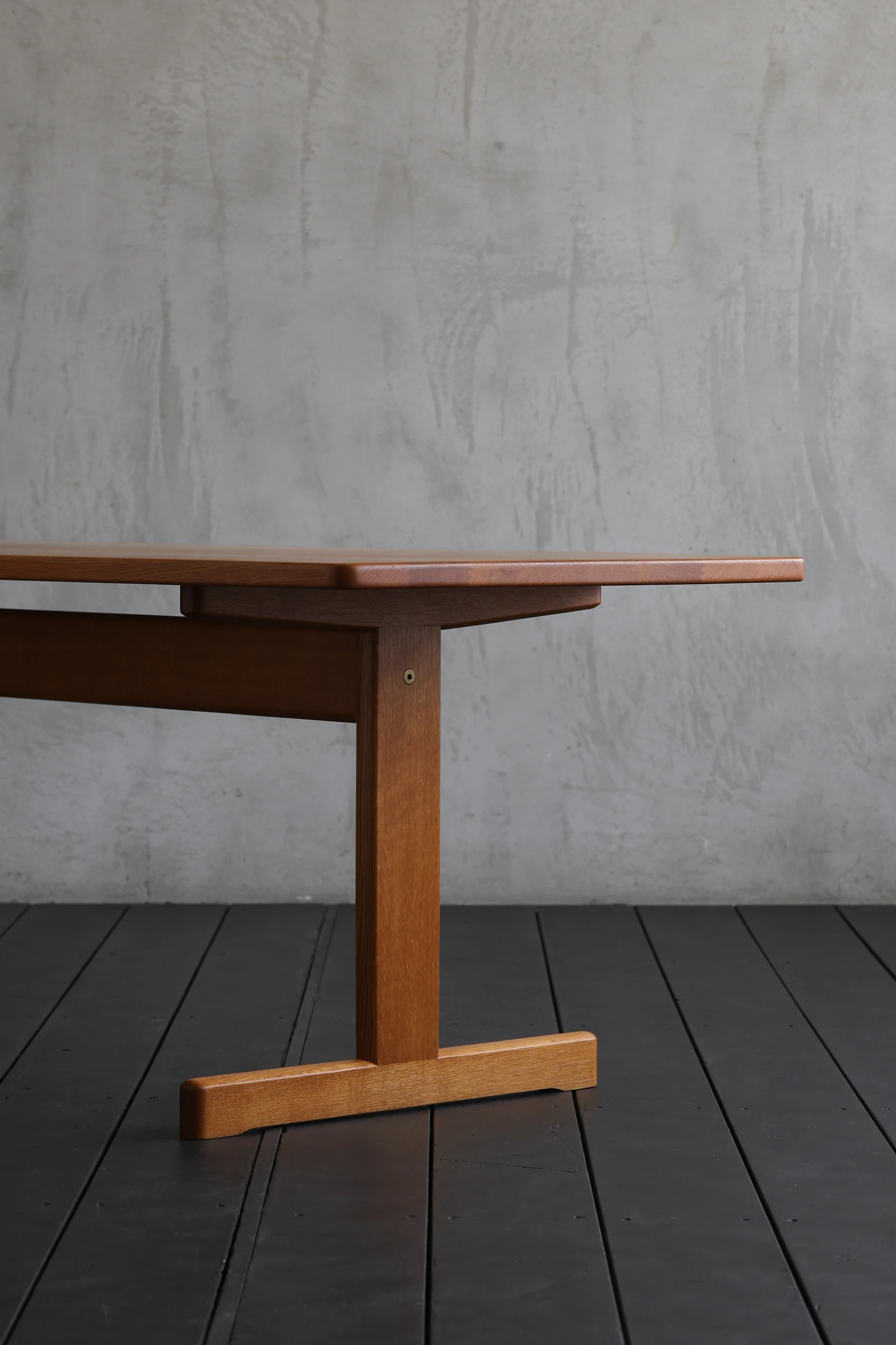 四つ脚が主流であった北欧のテーブルの中で、T字型のベースを採用した点が大きな特徴。ソファへの出入りの際に脚部へ膝をぶつけにくく、限られたスペースでも動作を妨げない合理的な設計と言える。これは戦後デンマークの住宅事情を背景に、家具を人間の動きから設計するというモーエンセンの姿勢をよく示している。十分な長さを確保しながら奥行きを抑えたプロポーションは、レイアウトの自由度を高め、現代の日本の住空間にとっても使いやすい。