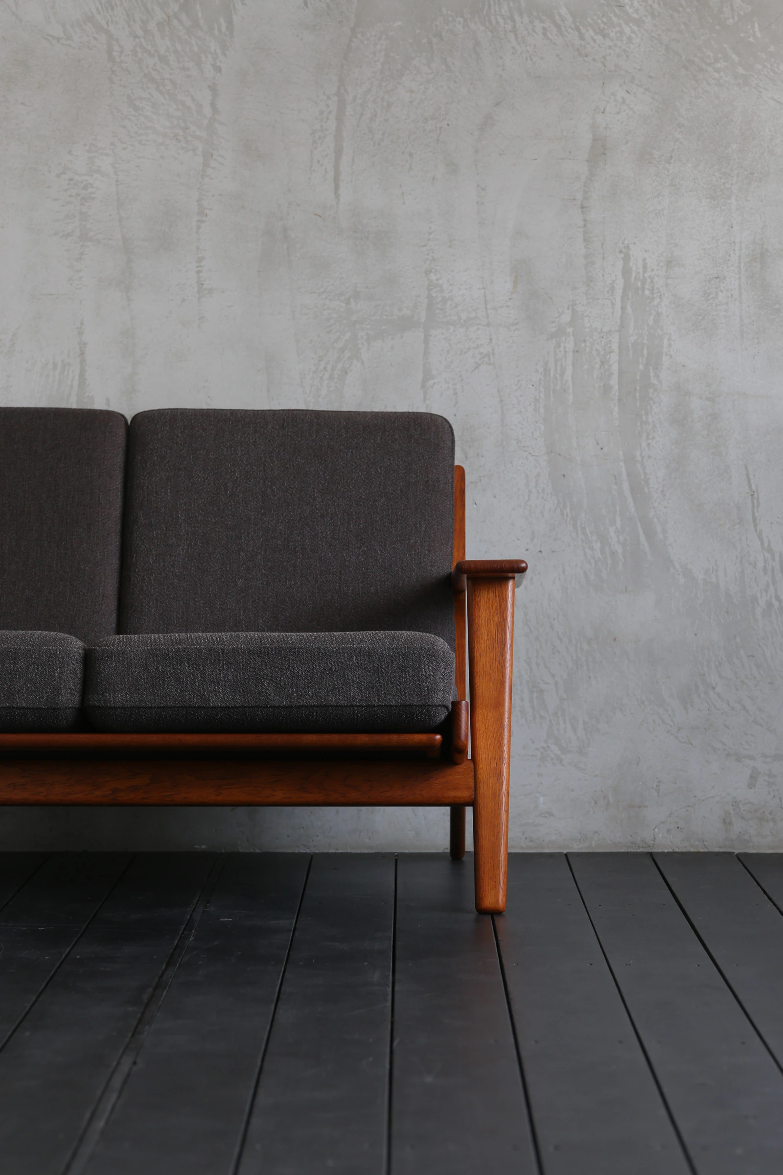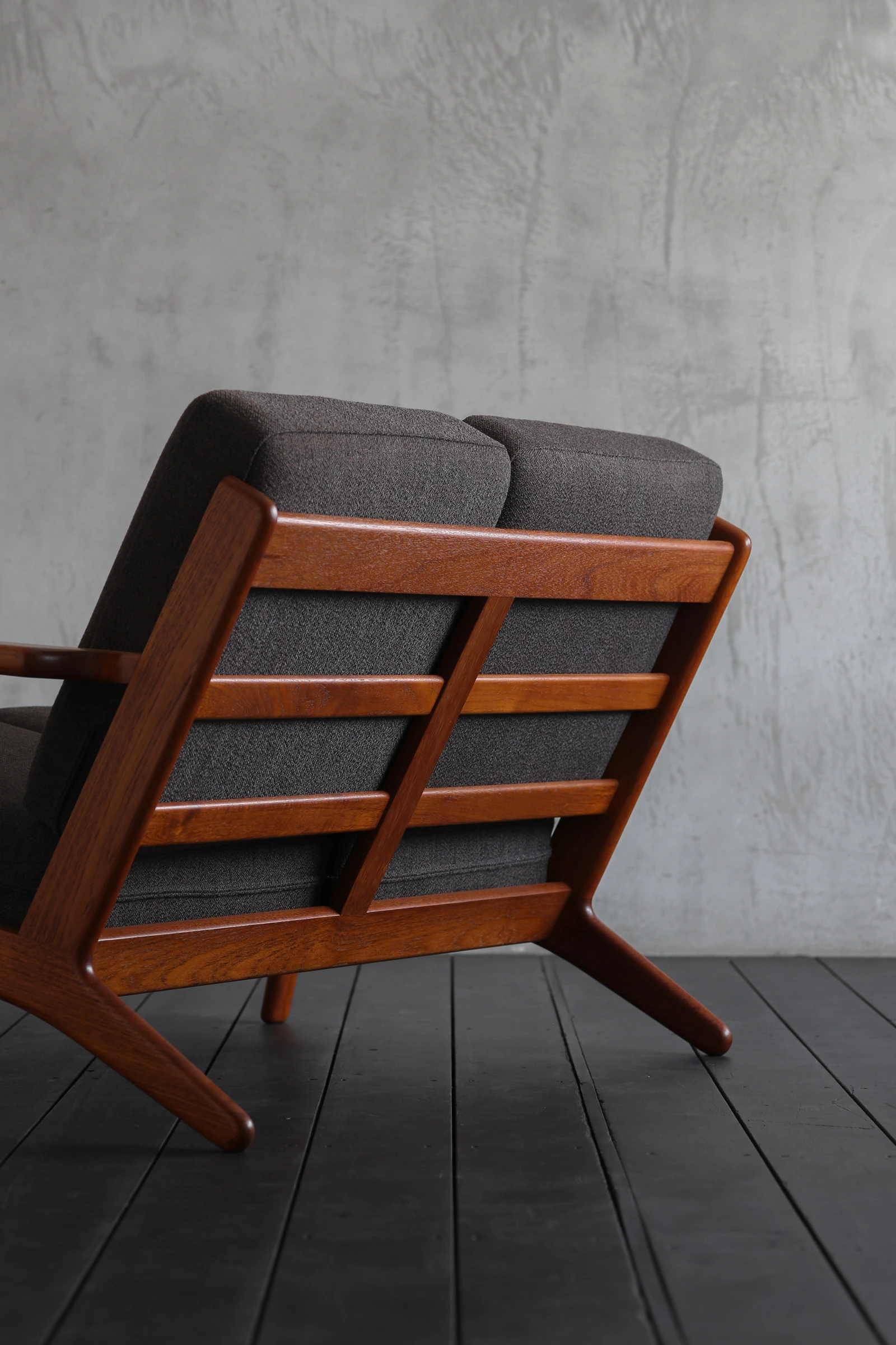 発表されたのは70年以上前の1953年。ウェグナーがデンマークのマットレスメーカーであるGETAMA社と協力して作り上げたソファだ。左右の座枠が後方へ伸びて後脚となる秀逸な構造は本作の印象を決定づけるシンボリックなデザイン。もちろん見た目だけでなく、人が座った際に後方にかかる荷重を効率的に分散する役割も担っている点も見逃せない。座り心地の良さも相まって、現在もなお世界中で愛され続けているベストセラーである。存在感のある幅広アームに手を添わせてみると、深く色付いたチーク材の滑らかな質感を堪能できる。ちなみにGE290の多くはオーク材でフレームが構成されているため、チーク材の仕様は希少性が高い。