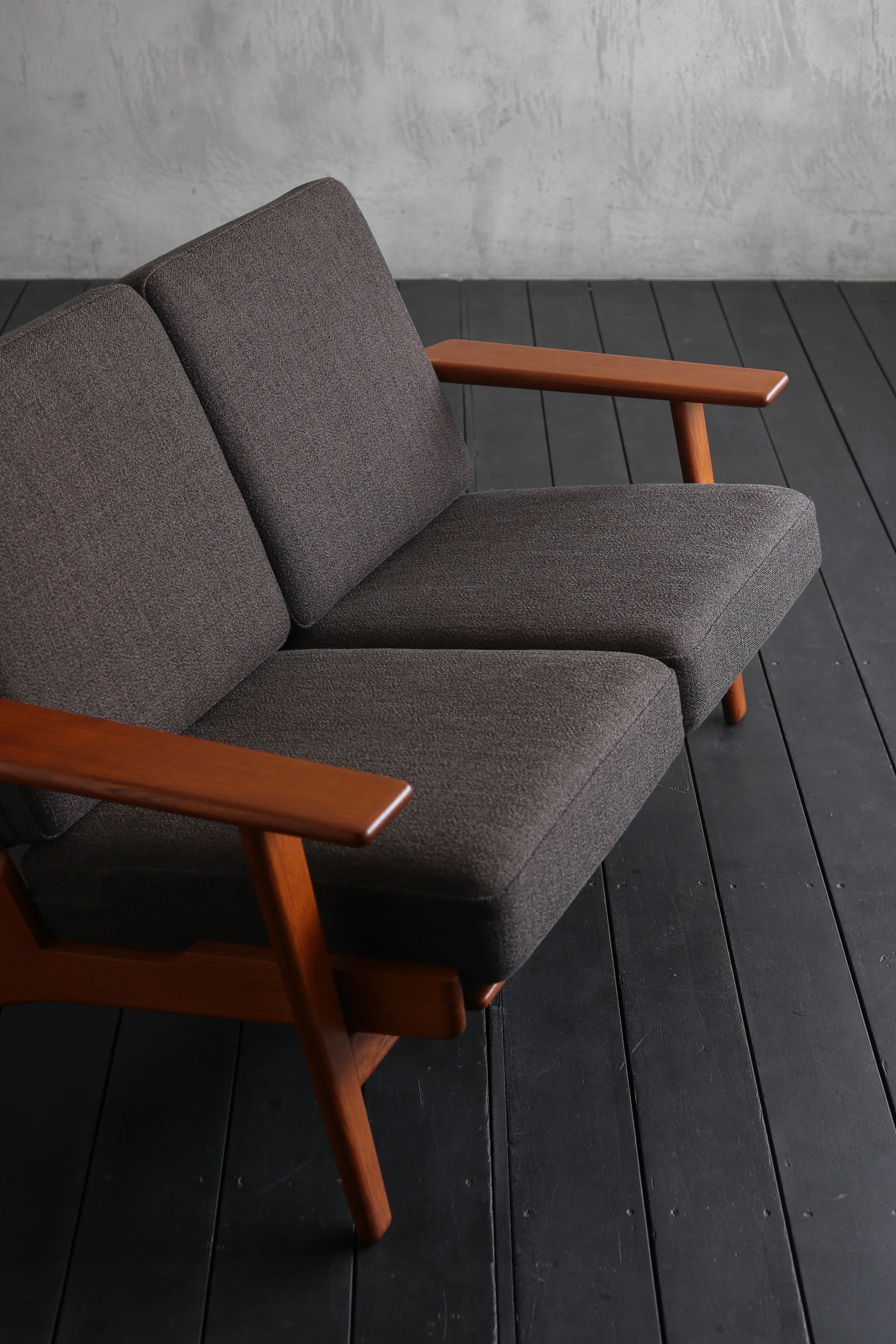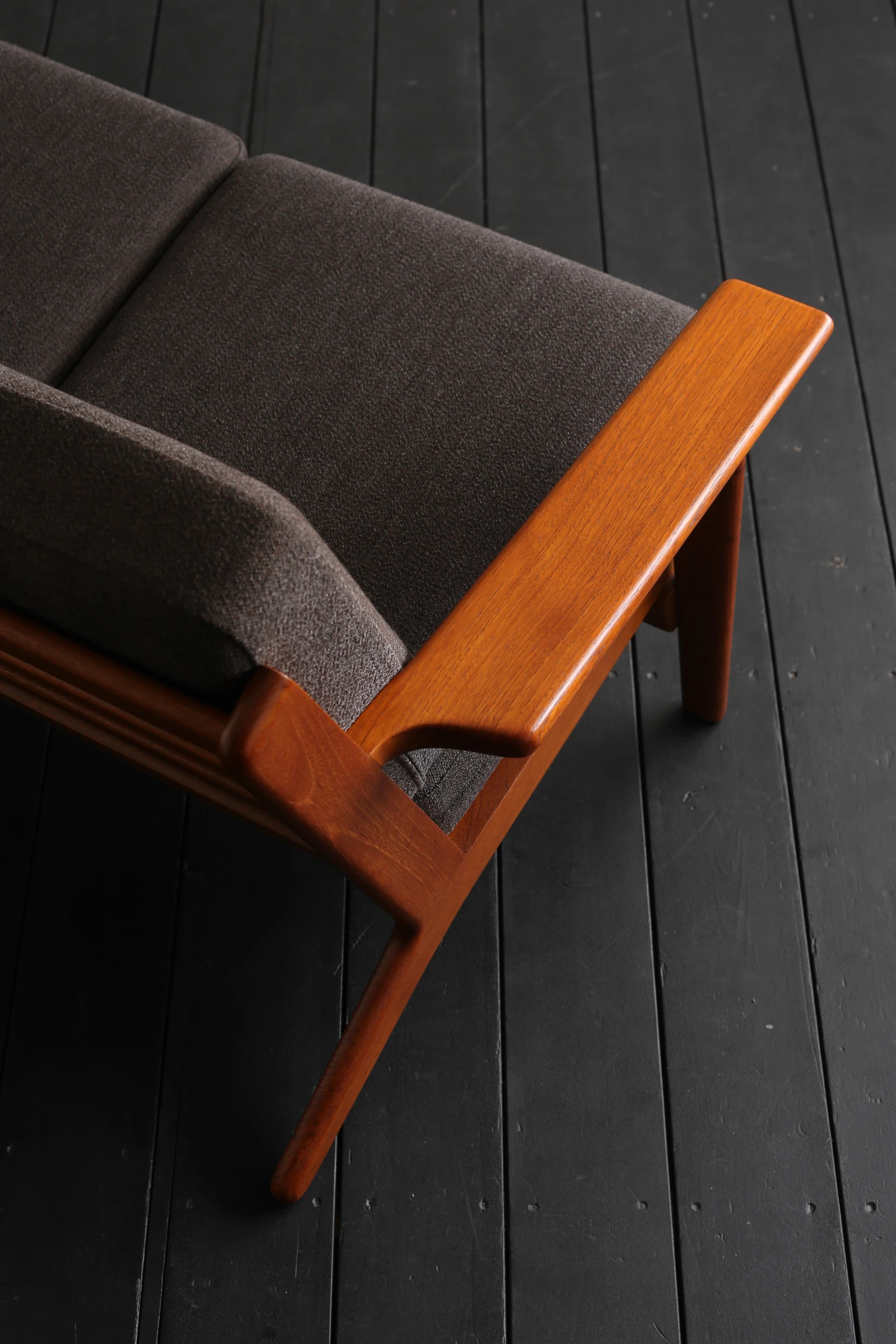 国内にて張替および内部ウレタンの交換を済ませており、ファブリックにはデンマークのファブリックメーカー Kvadratの「Ecriture(エクリチュール)」のダークブラウンの生地をセレクトいたしました。Ecriture(フランス語で「筆跡」)の名の通り、細かな色糸の交差によって、筆で描いたような繊細な表情を持っています。グレー系の糸も編み込まれており、モダンな印象で、チーク材との相性も良く、全体として落ち着きのある佇まいに仕上がっています。