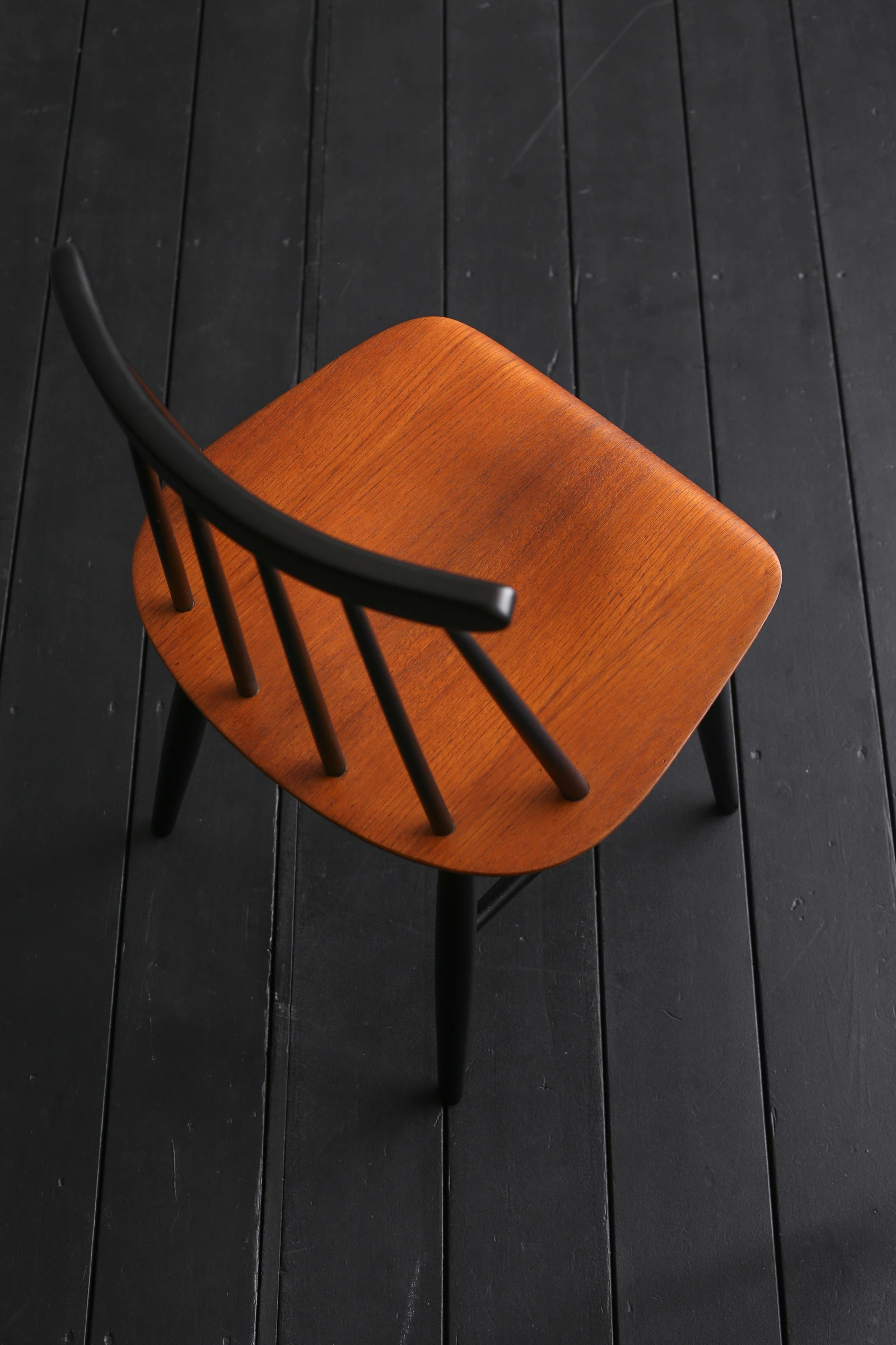 スッと伸びた背中のスポークは、17世紀後半にイギリスで誕生したウィンザーチェアに連なるデザイン。本作はスポークが6本の初期モデル(後期モデルはスポークが7本)。ファネットチェアの最大の特徴は、その視界の抜けのよさと軽やかなたたずまい。前後左右どこから見てもスマートでさまになるから、複数セットでダイニングに置くのはもちろん、単体でデスクやドレッサーに合わせても雰囲気がいい。チーク材の座面は中央にはお尻のかたちに沿うように凹みが設けられ、前面には緩やかなカーブがつけられている。また、背中のスポークは1本1本微妙に角度が変えられ、からだに上手くフィット。こうした巧みなデザインにより、クッション材がなくとも驚くほどやわらかい座り心地を実現している。