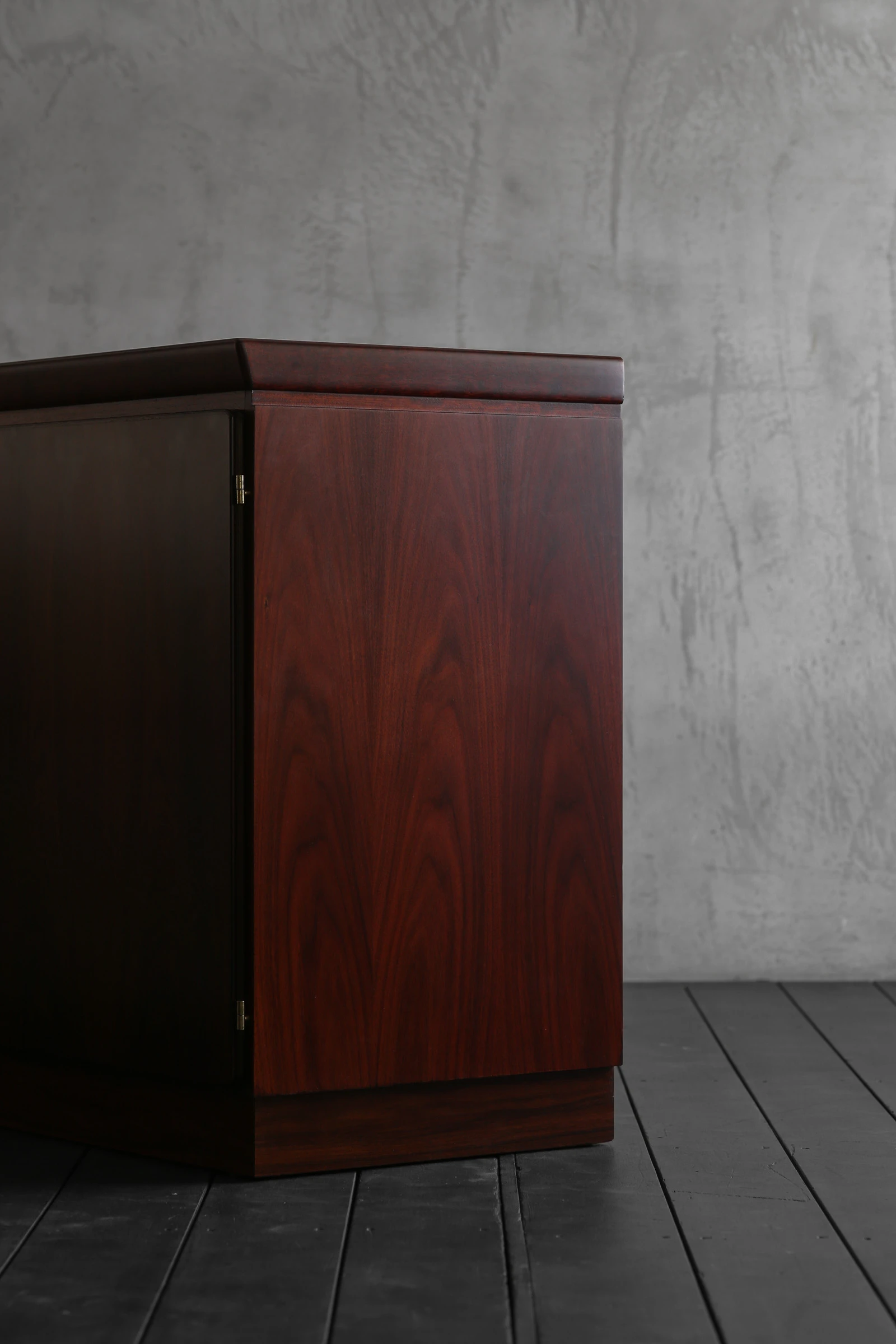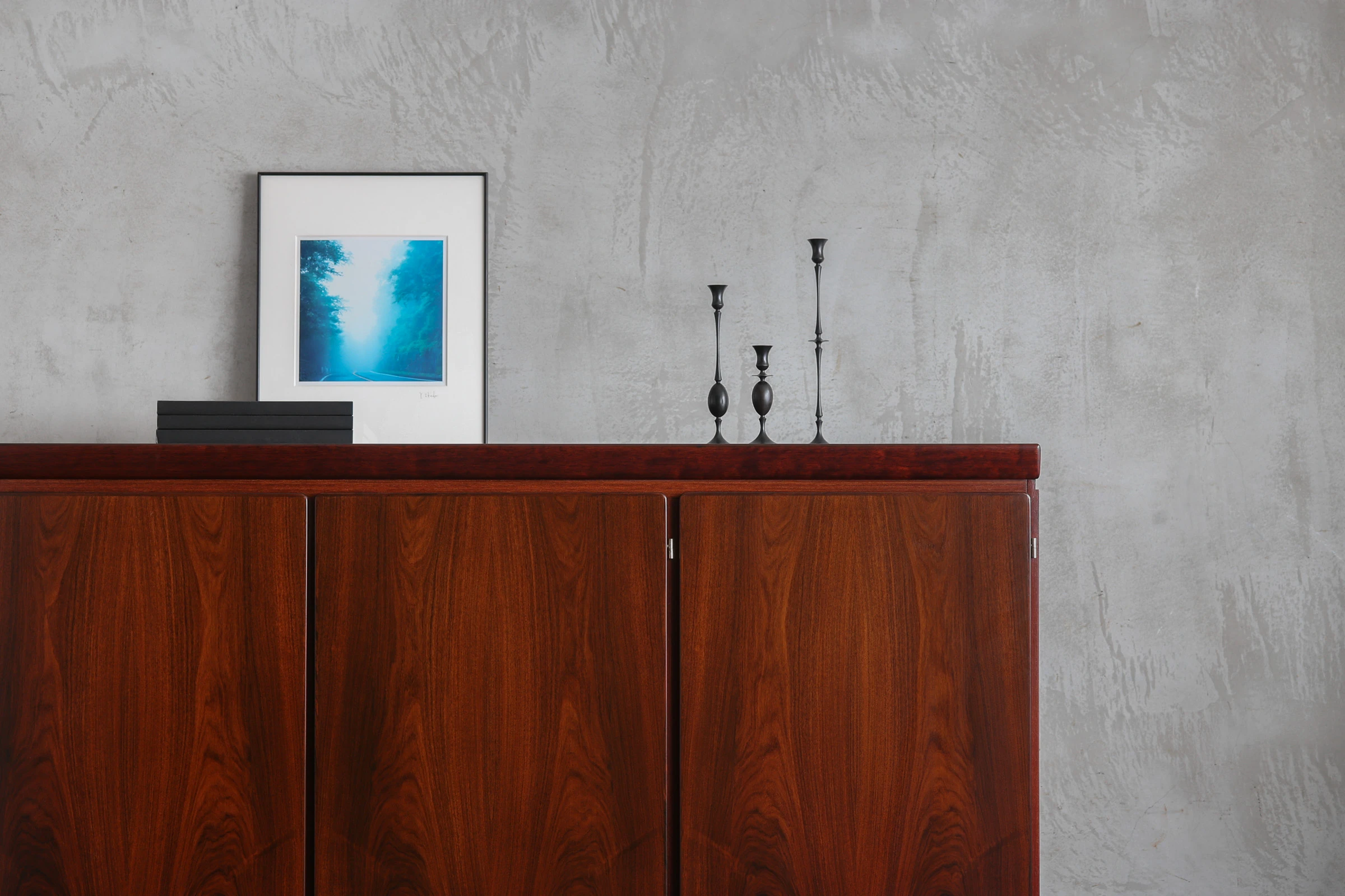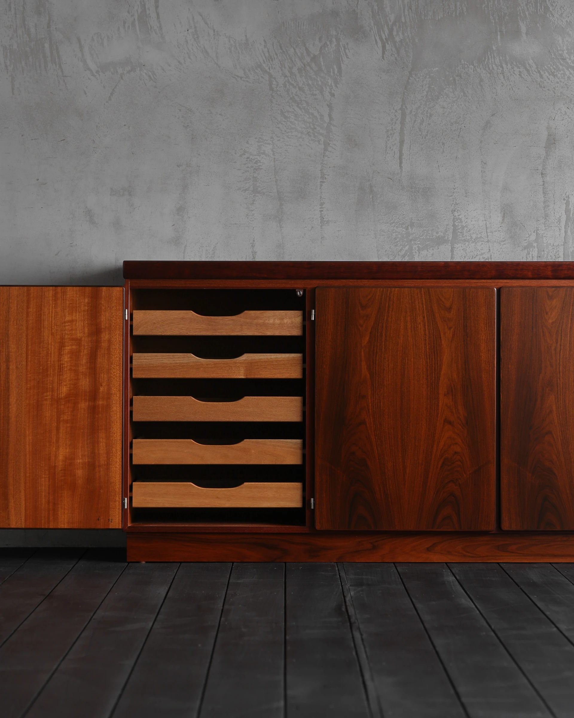 60年代にデンマークで製作されたローズウッドのキャビネット。手掛けたのは老舗メーカー、Skovby Mobelfabrik。1933年創業の同社は、長年にわたりダイニング家具を中心に高品質な家具を生み出してきたメーカーであり、確かな木工技術と実用性を重視した設計で知られている。本作もまた、実直にローズウッドの力強い表情を丁寧に引き出した美しい佇まいが魅力的。