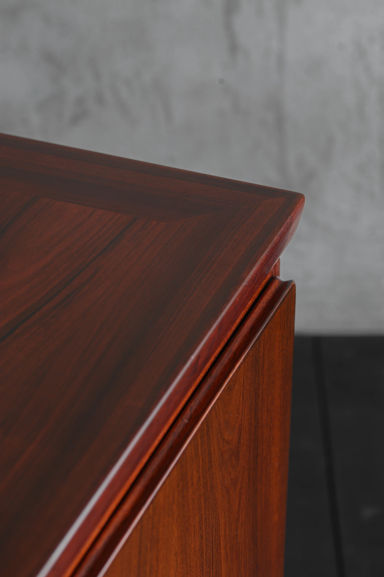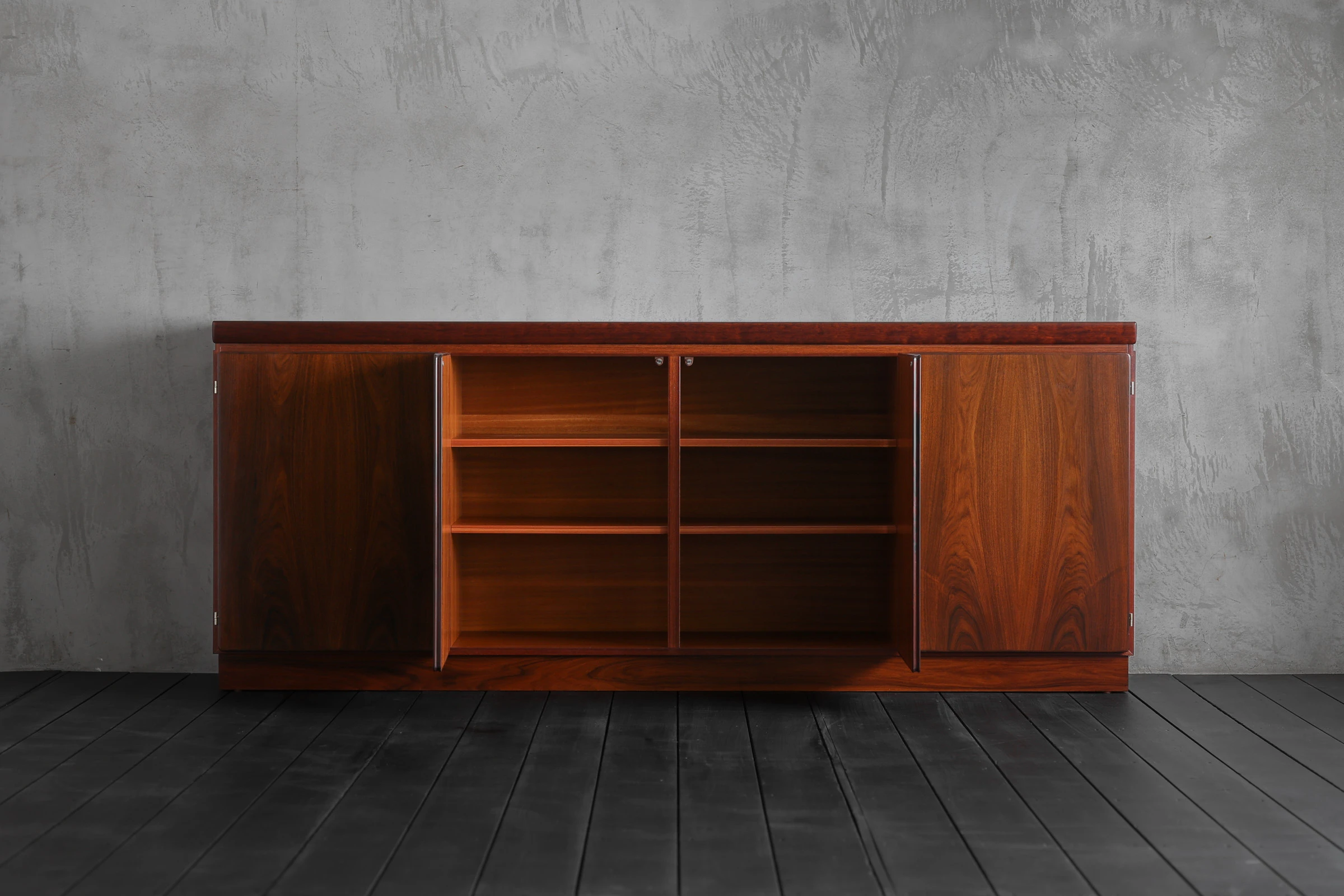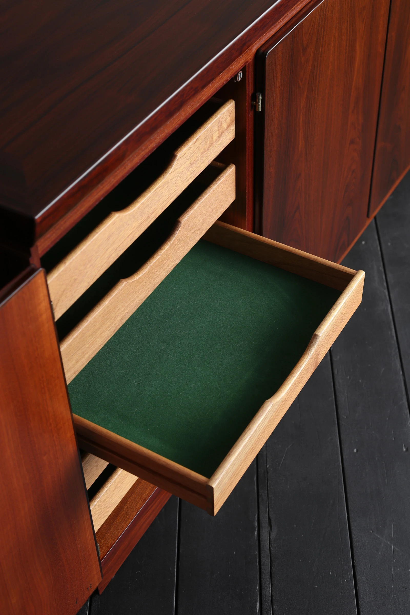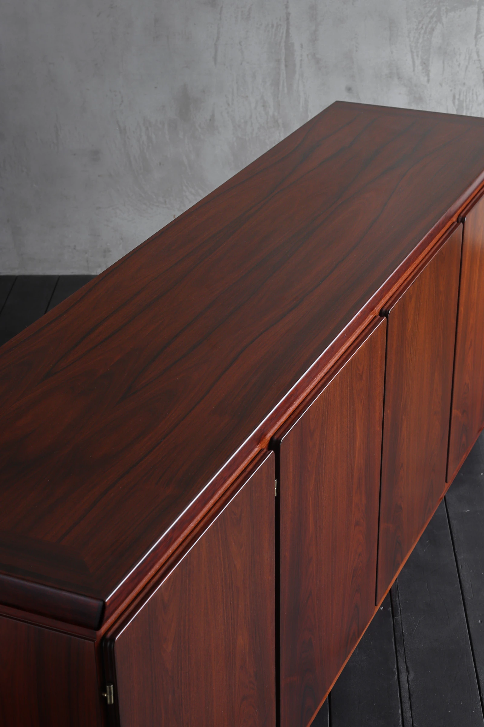 60年代にデンマークで製作されたローズウッドのキャビネット。手掛けたのは老舗メーカー、Skovby Mobelfabrik。1933年創業の同社は、長年にわたりダイニング家具を中心に高品質な家具を生み出してきたメーカーであり、確かな木工技術と実用性を重視した設計で知られている。本作もまた、実直にローズウッドの力強い表情を丁寧に引き出した美しい佇まいが魅力的。