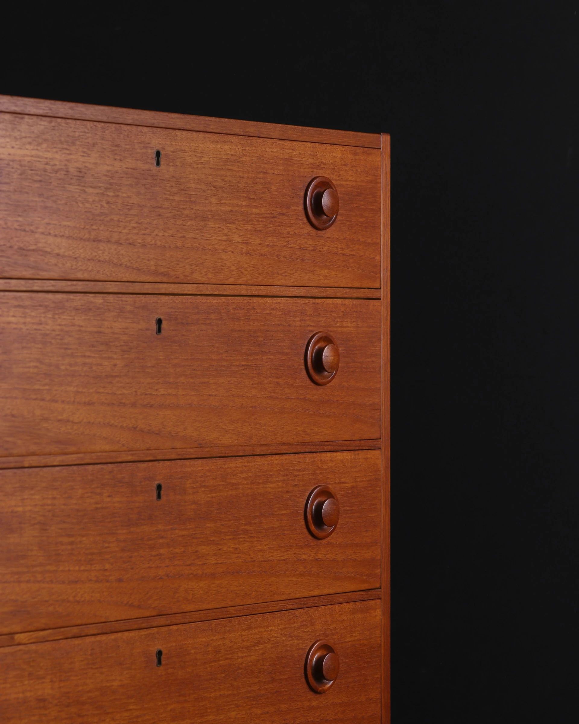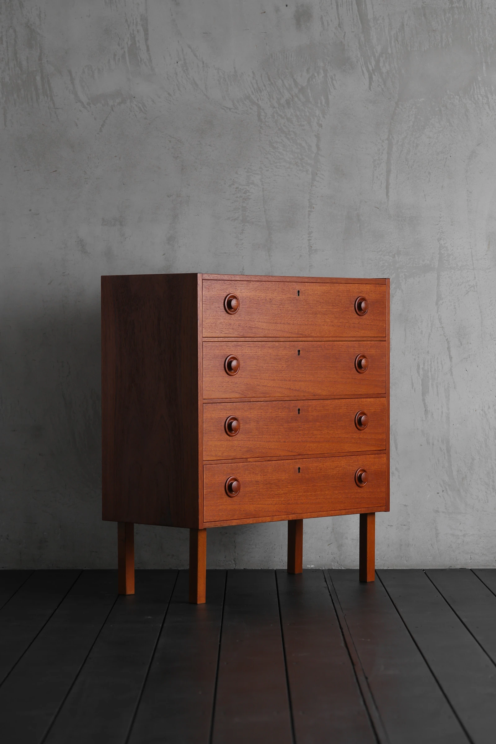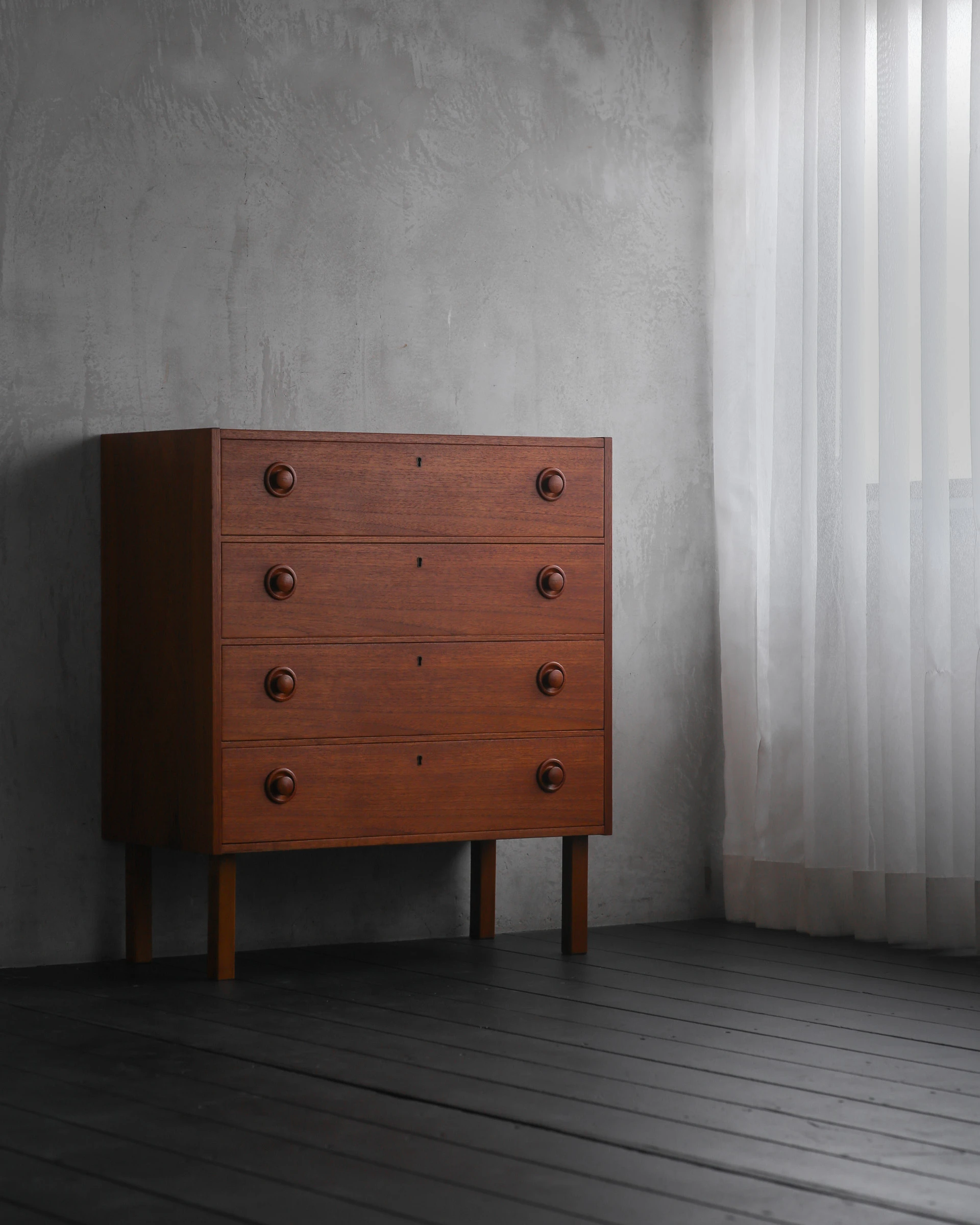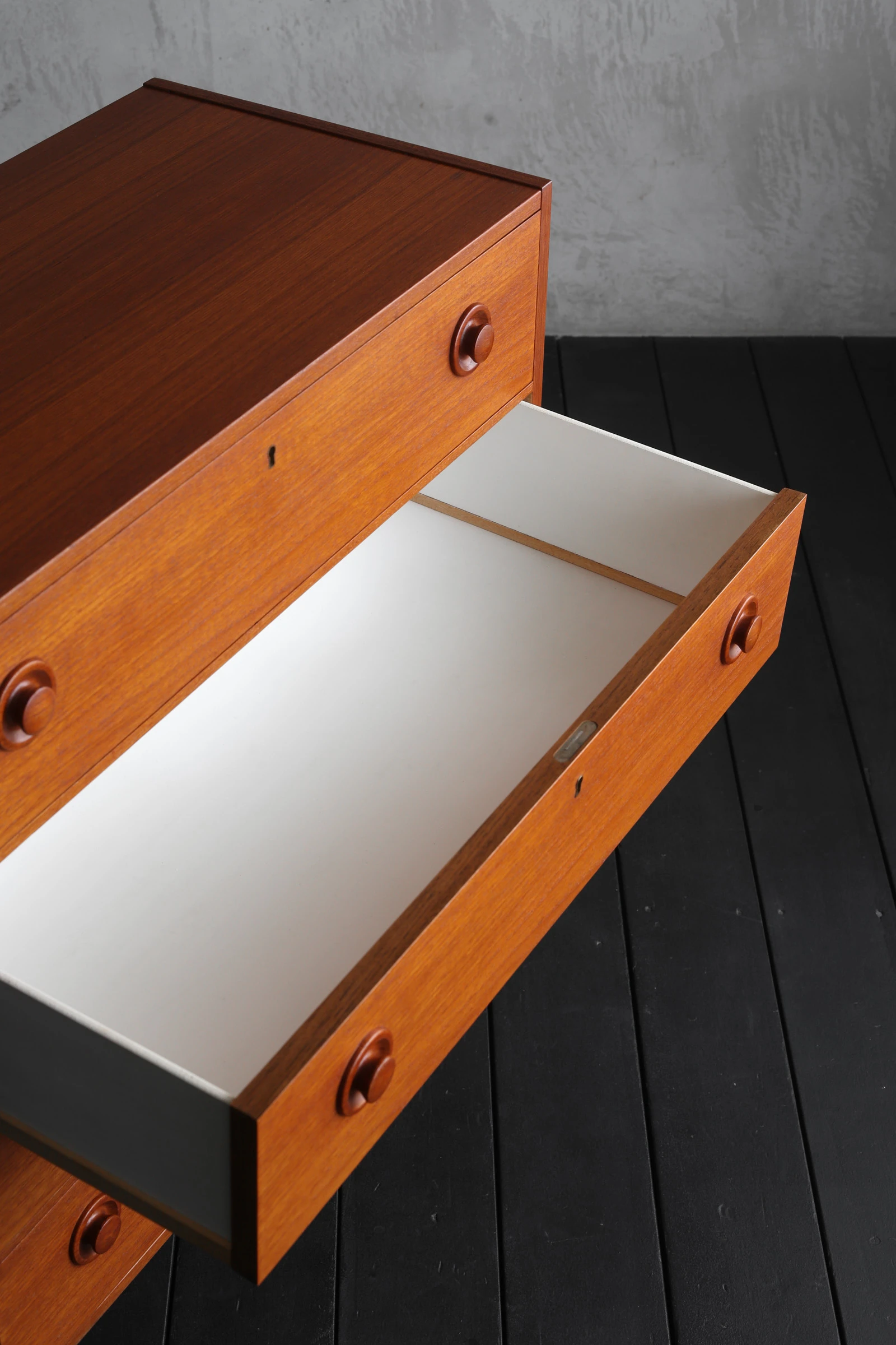 1960年代スウェーデン製のアノニマスチェスト。素材にはチークとビーチが用いられており、温かみと軽やかさが絶妙なバランスで共存している。各抽斗には左右にひとつずつ、小ぶりで端正な無垢材の取っ手が付き、旋盤で丁寧に削り出されたそのフォルムは、控えめながら目を引く佇まいだ。手をかけたときの収まりがよく、何気ない所作にも品が宿る。